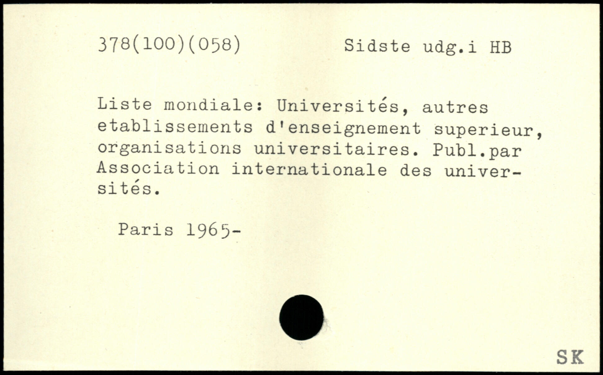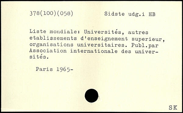 Liste mondiale; Universités, autres etablissements d'enseignement supérieur, organisations universitaires. Publ.par Association internationale des universités.