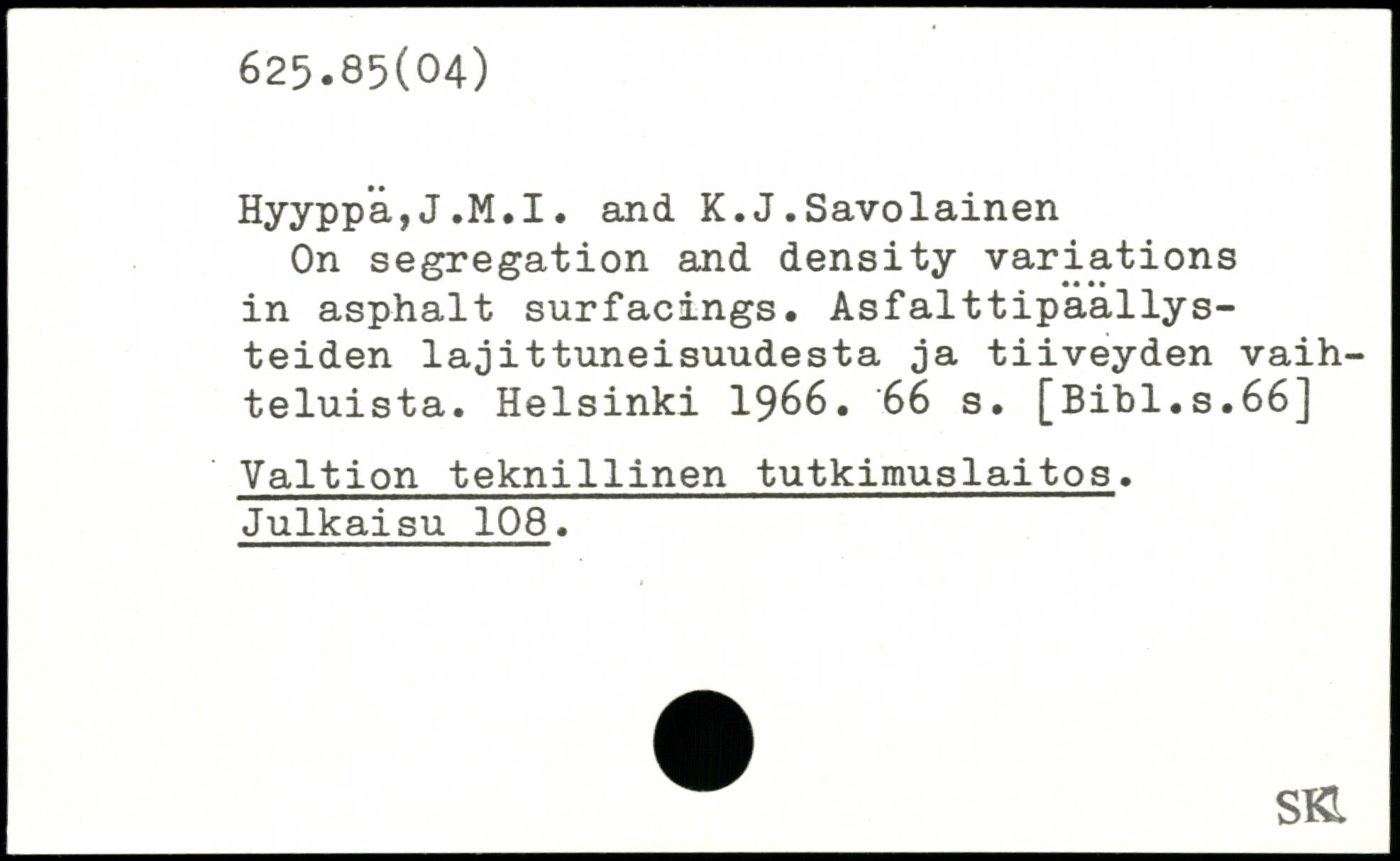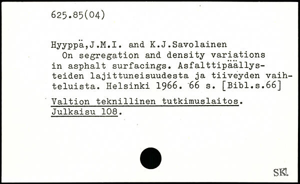 On segregation and density variations in asphalt surfacings. Asfalttipaallys-teiden lajittnneisuudesta ja tiiveyden vaih-teluista.
