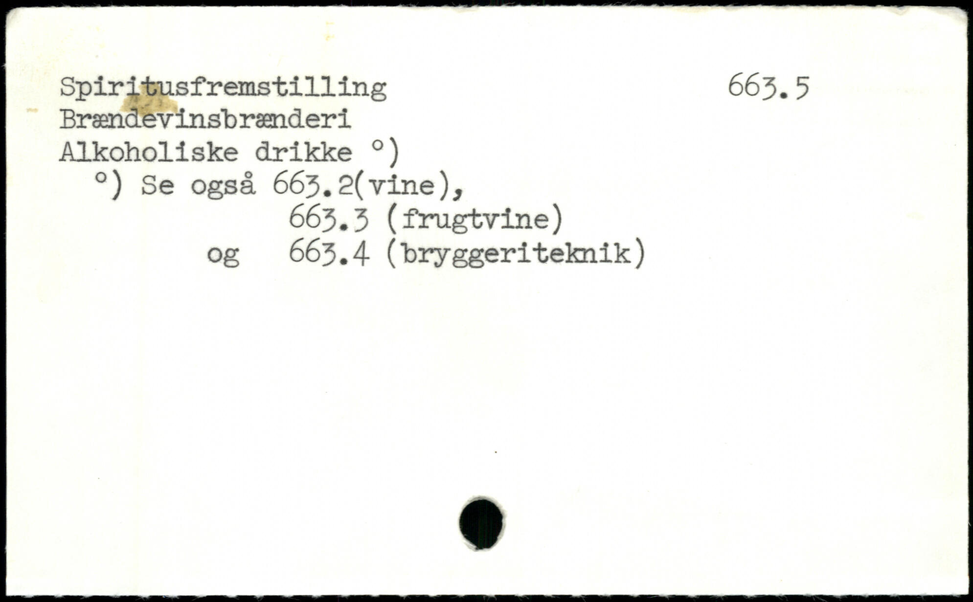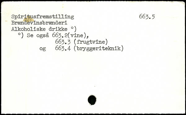 Spir^tusfremst1111ng 663.5 Brændevinsbrænder! Alkoholiske drikke .) .) Se også 663.2(vine), 663.3 (frugtvine) og 663.4 (bryggeriteknik)