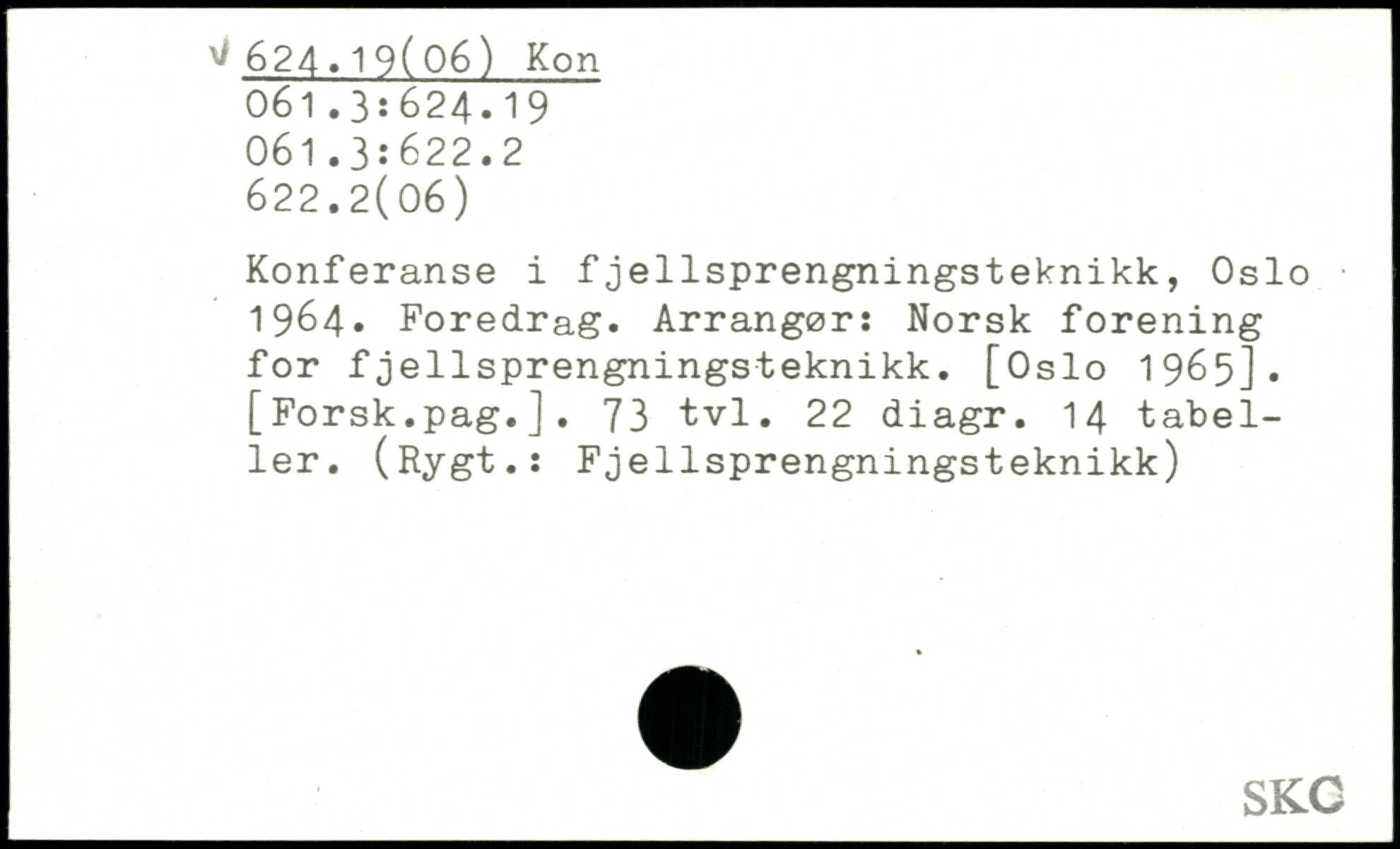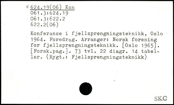 Konferanse i fjellsprengningsteknikk, Oslo ■ 1964. Foredrag. Arrangør: Norsk forening for fjellsprengningsteknikk. [Oslo 1965]. [Forsk.pag.]. 73 tvl. 22 diagr. 14 tabeller. (Rygt.: Fjellsprengningsteknikk)