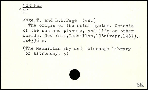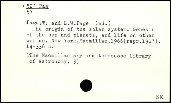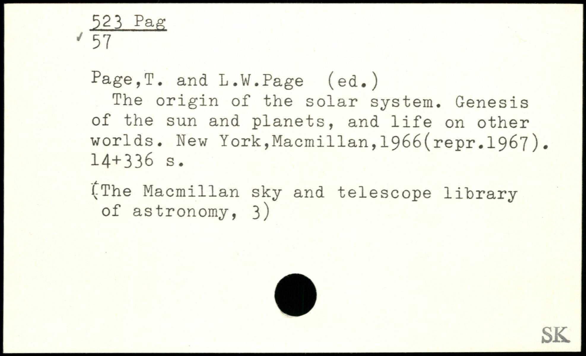 The origin of the solar system. Genesis of the sun and planets, and life on other worlds.