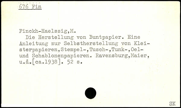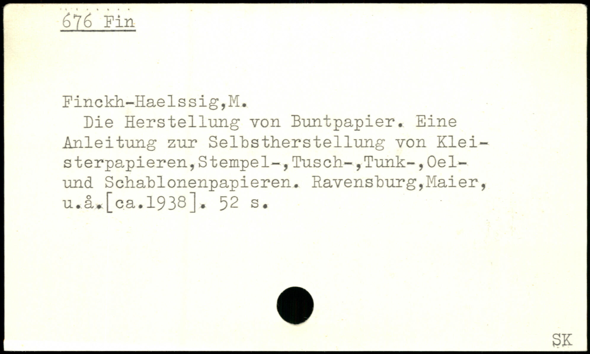 Finckh-Hae1s s ig,M. Die Herstellung von Buntpapier. Eine Anleitung zur Selbstherstellung von Kleisterpapieren, Stempel- ,Tusch-,Tunk-,Oel-und Schablonenpapieren. Ravensburg,Maier, u.ä.[ca. 1938].