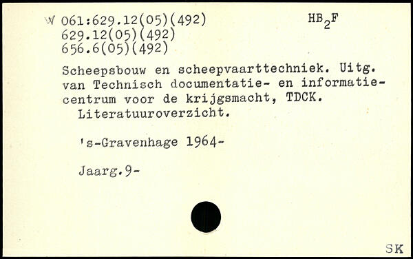 Scheepsbouw en scheepvaarttechniek. Uitg. van Technisch documentatie- en informatie-centrum voor de krijgsmacht, TDCK. Literatuuroverzieht. 's-Gravenhage 1964“ Jaarg.9“