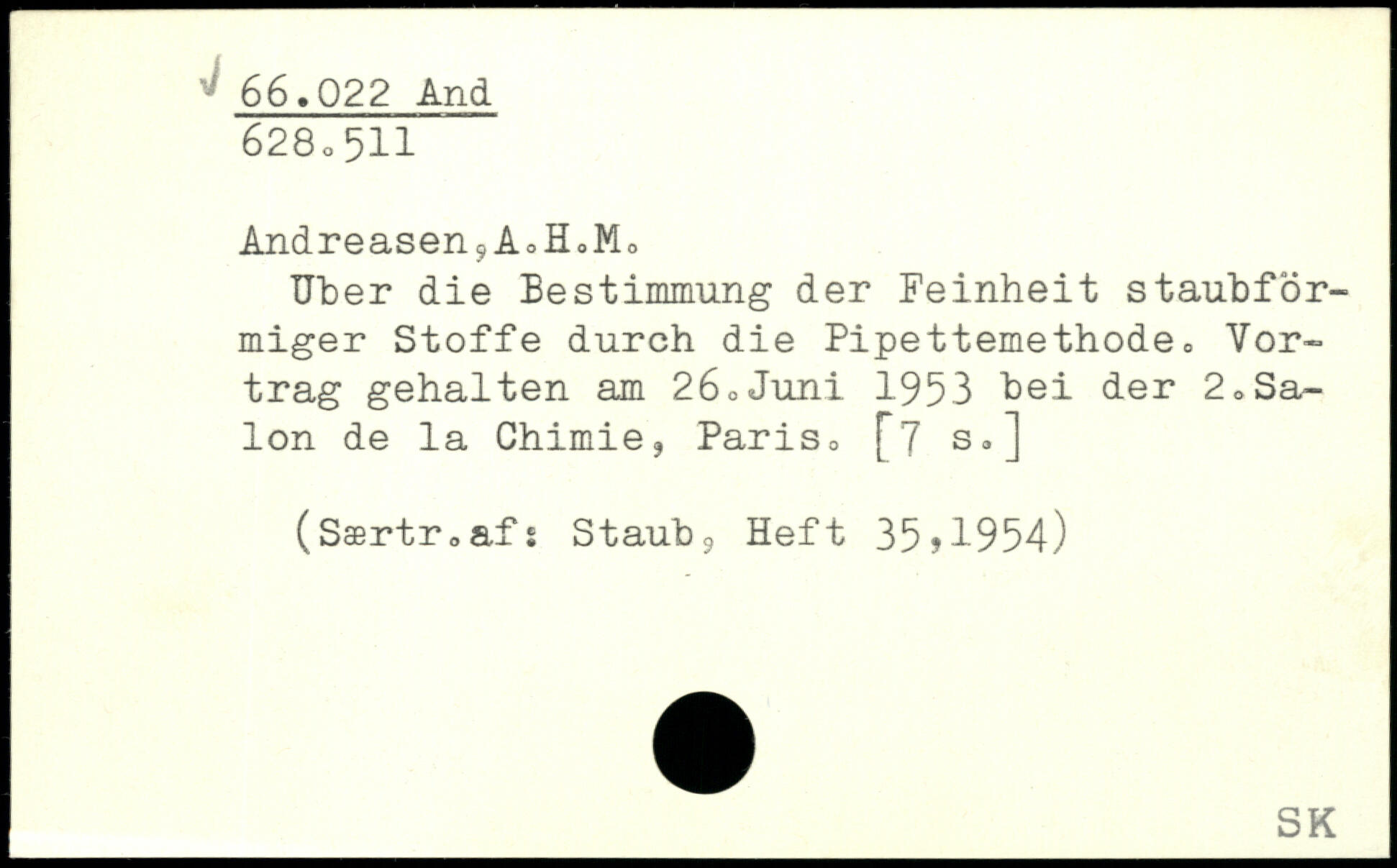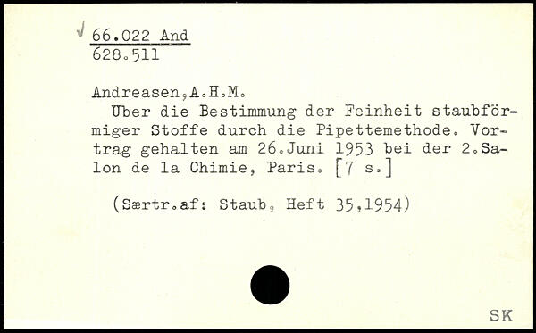 Uber die Bestimmung der Feinheit staubförmiger Stoffe durch die Pipettemethode. Vortrag gehalten am 26,Juni 1953 bei der 2.Salon de la Chimie, Paris. [