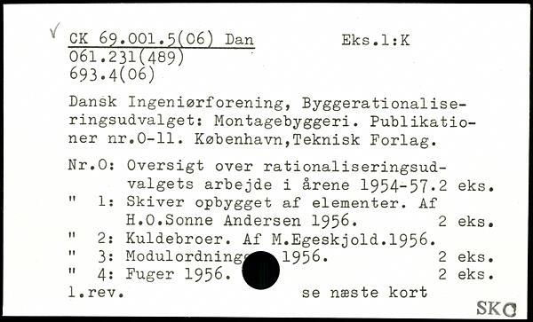 Dansk Ingeniørforening, Byggerationaliseringsudvalget : Montagebyggeri. Publikationer nr.0-11. København,Teknisk Porlag. Nr.O: Oversigt over rationaliseringsudvalgets arbejde i årene 1954-57.2 eks. j " 1: Skiver opbygget af elementer. Af H.O.Sonne Andersen 1956. 2 eks. " 2: Kuldebroer. Af M.Egeskjold.1956. j " 3: Modulordningj^^ 1956. 2 eks. j 4: Fuger 1956. 2 eks. l.rev. se næste kort