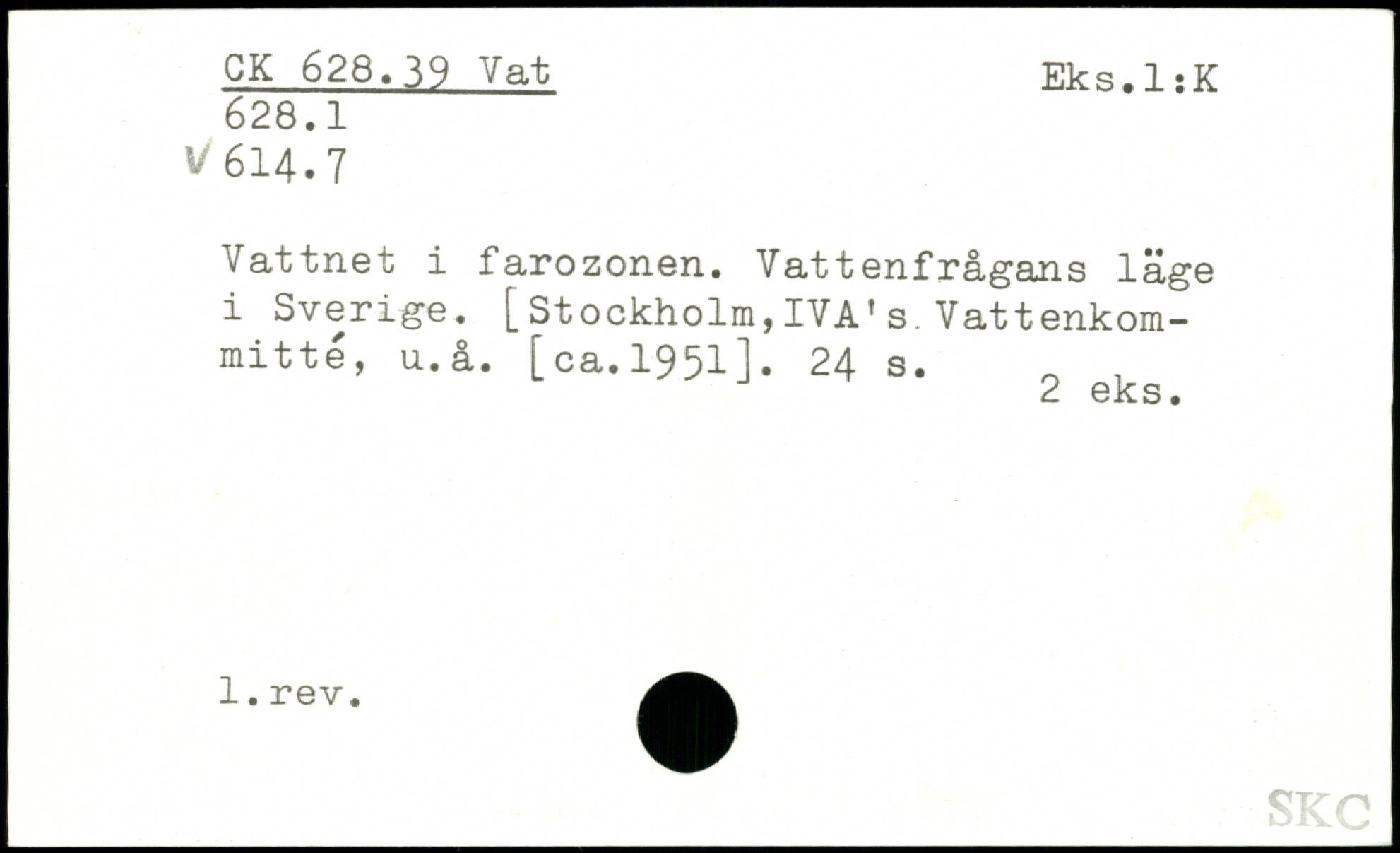 Vattnet i farozonen. Vattenfrågans läge i Sverige. [Stockholm,IVA’s. Vattenkom-mitte, u.å. [ca.1951l.