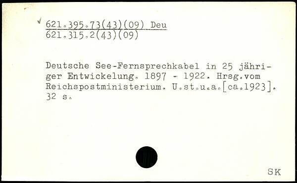 Deutsche See-Fernsprechkabel in 25 jähriger Entwickelung™ 1897 - 1922. Hrsg.vom Reichspostministerium. U=>st ™ u.ae[ca.1923].