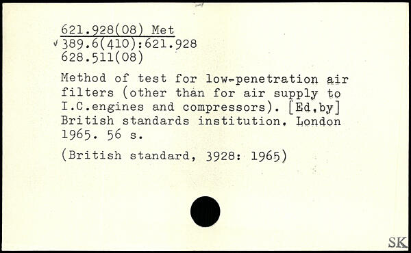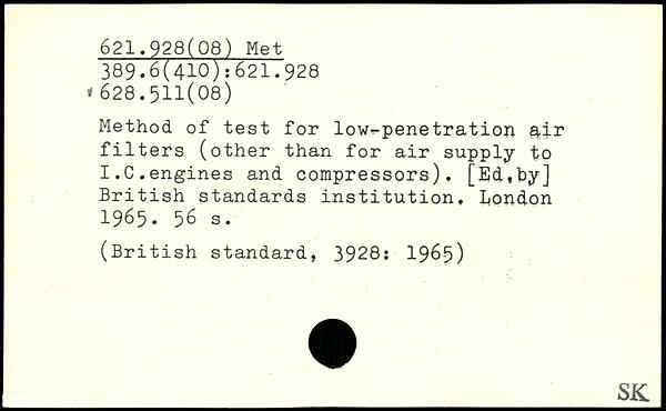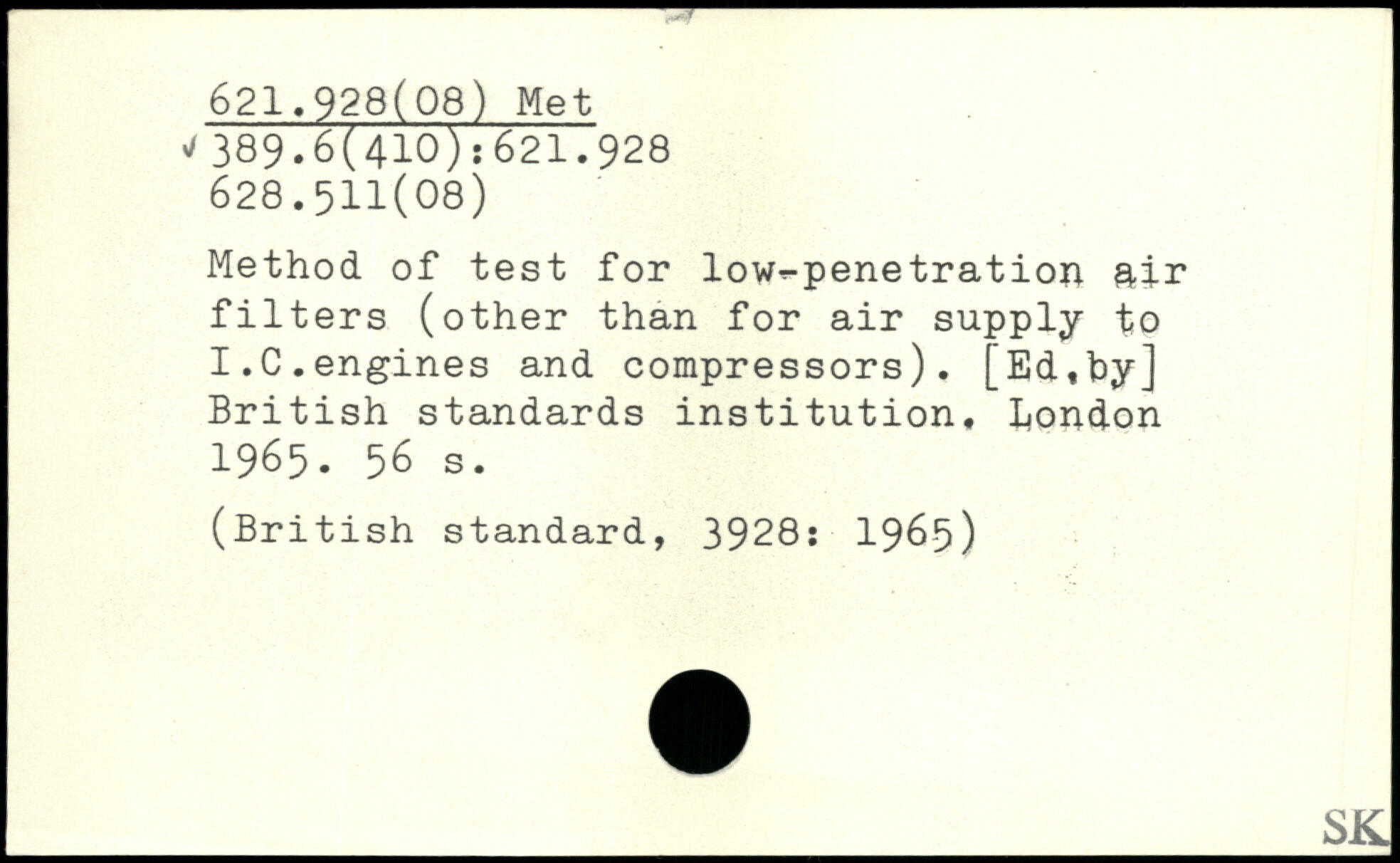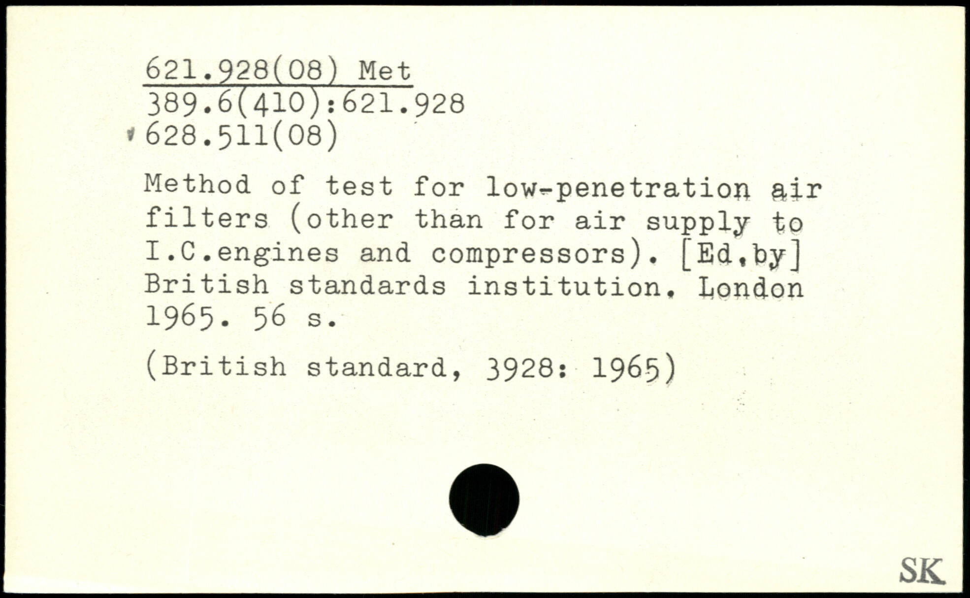 Method of test for low^penetration air filters (other than for air supply to I.C.engines and compressors). [Ed,by] British standards institution, hondon 1965.