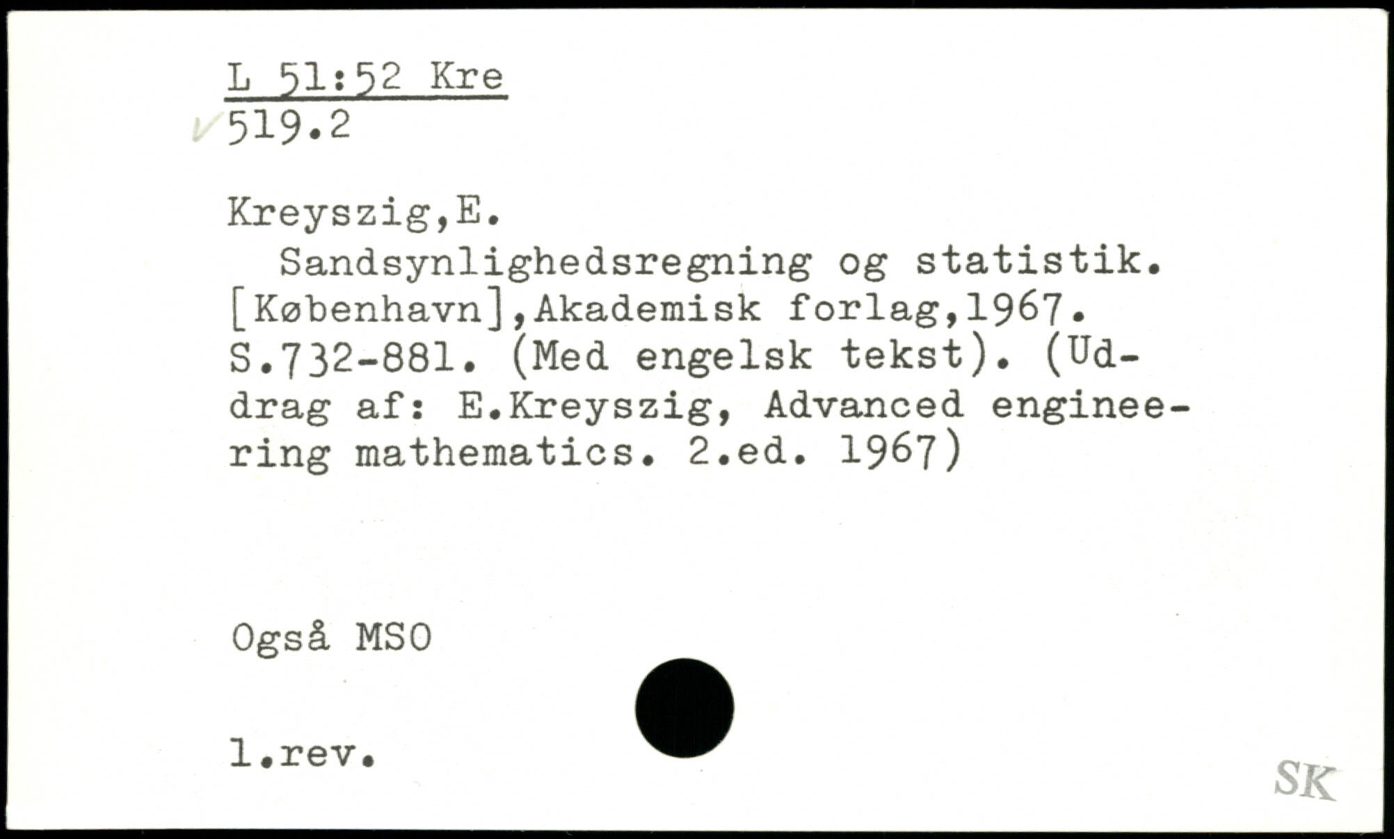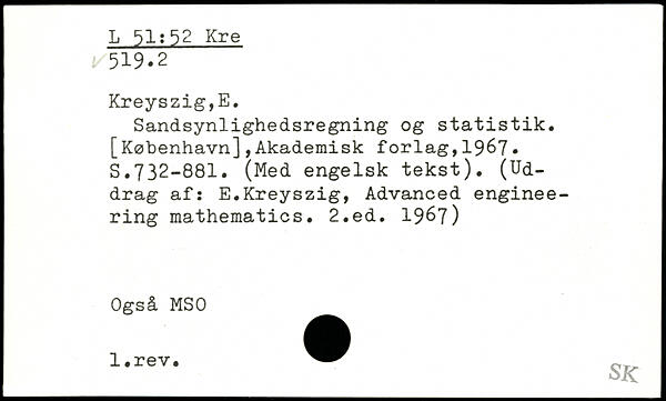 Sandsynlighedsregning og statistik. [København],Akademisk forlag,19^7. S.732-881. (Med engelsk tekst). (Uddrag af: E.Kreyszig, Advanced engineering mathematics.