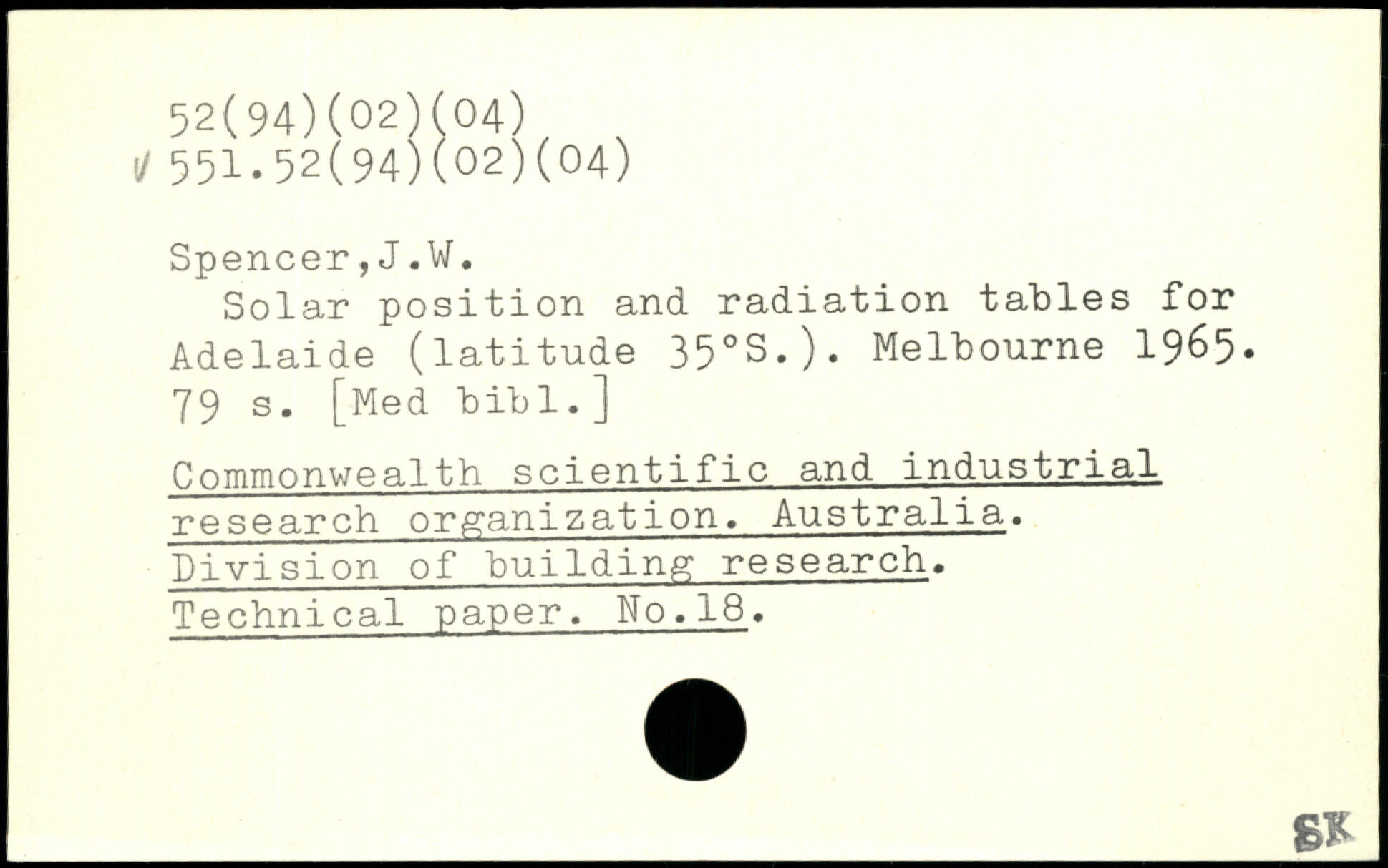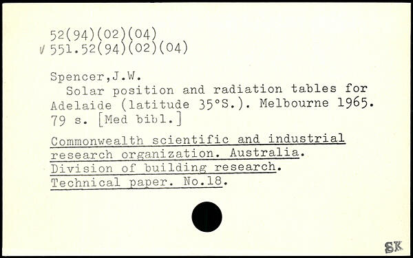 Solar position and radiation tables for Adelaide (latitude 35.S.). Melbourne 1965-