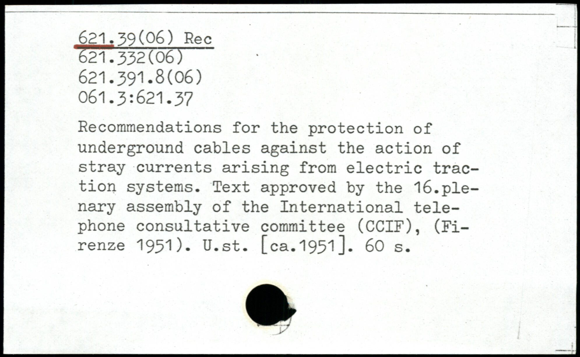 Recommendations for the protection of underground cables against the action of stray currents arising from electric traction systems. Text approved by the 16.plenary assembly of the International telephone consultative committee (CCIF), (Firenze 1931). U.st. [ca.1931].