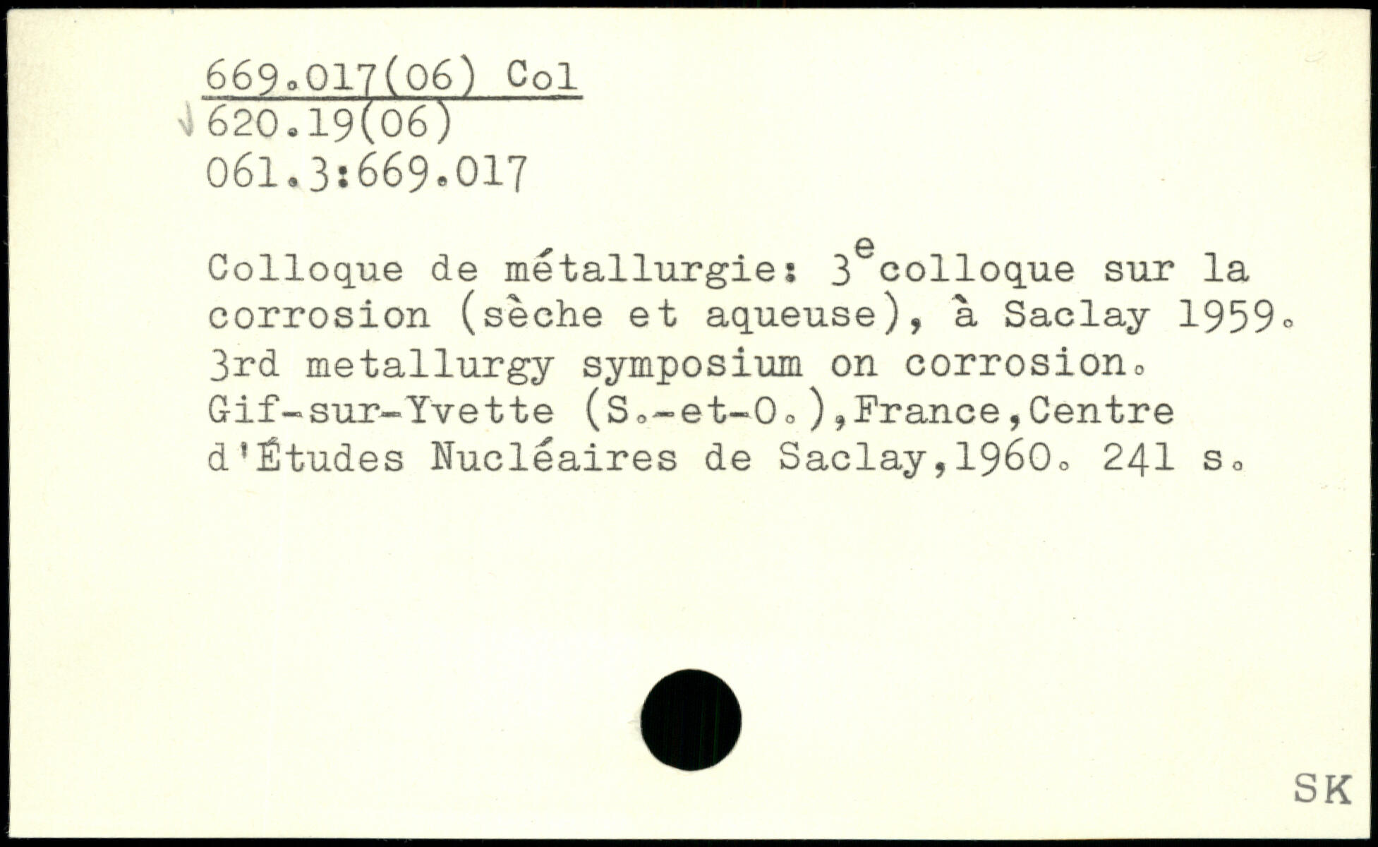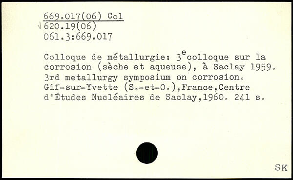 Colloque de métallurgie: 3 colloque sur la corrosion (sèche et aqueuse), a Saclay 1959. 3rd metallurgy symposium on corrosion. Gif-sur-Yvette (S,-et-0o),France,Centre d’Études Nucléaires de Saclay,19600