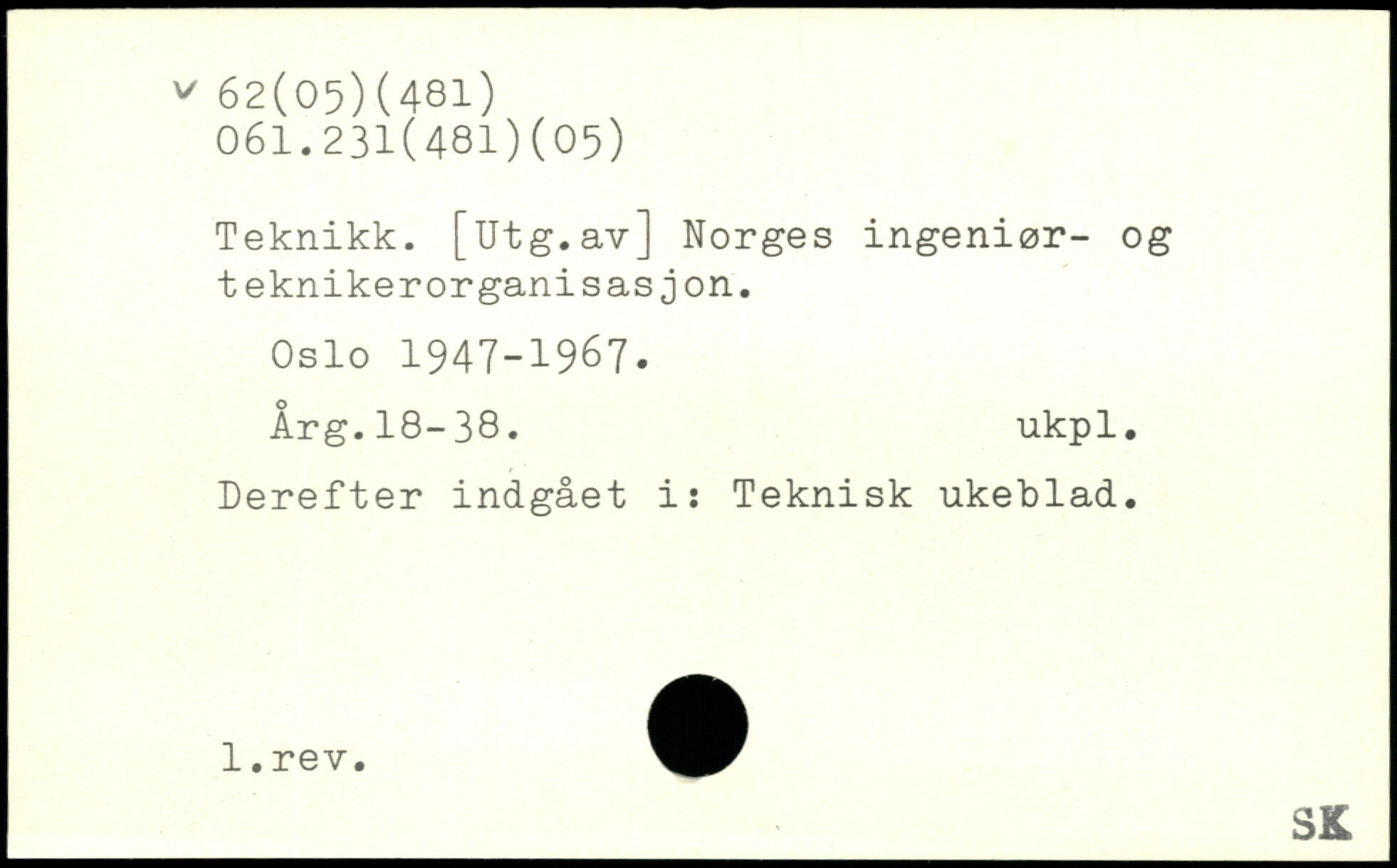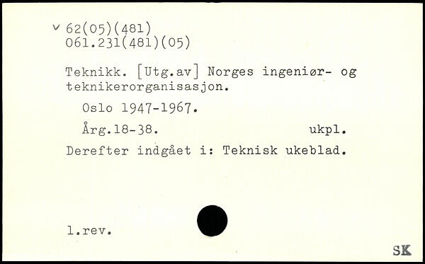 Teknikk. [utg.av] Norges ingeniør- og teknikerorganisasjon. Oslo 1947-1967. Årg.18-38. ukpl. Derefter indgået i: Teknisk ukeblad.