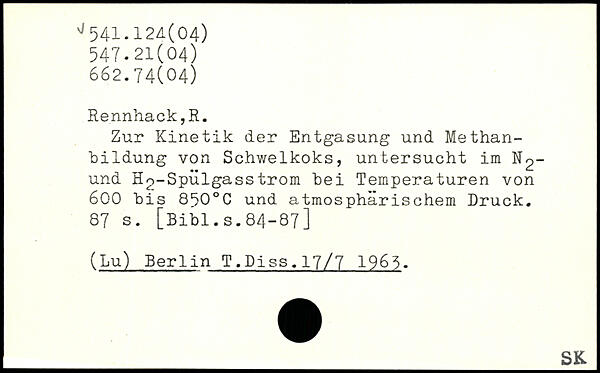 Zur Kinetik der Entgasung und Methanbildung von Schwelkoks, untersucht im N2-und Ho-Spülgasstrom bei Temperaturen von 600 bis 850.C und atmosphärischem Druck.