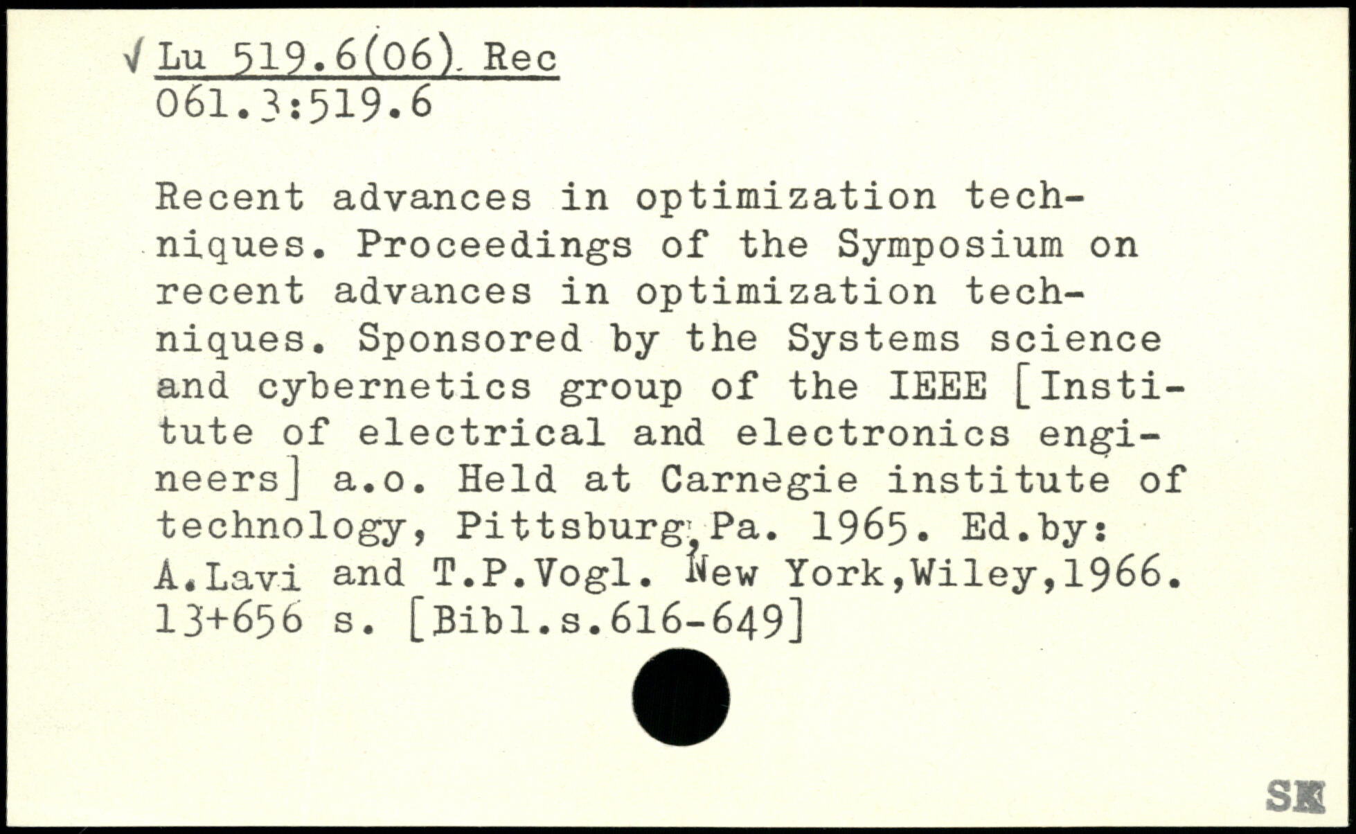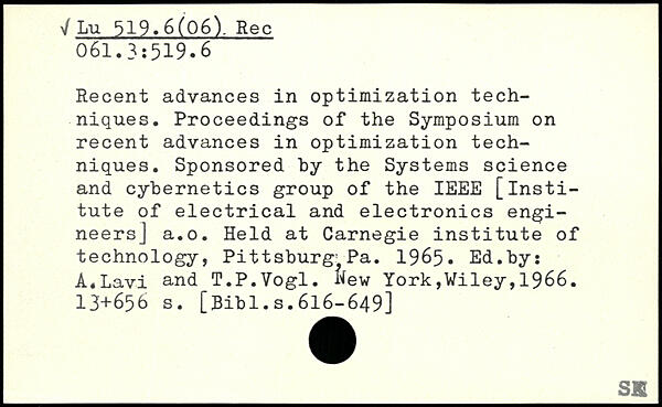 Recent advances in optimization techniques. Proceedings of the Symposium on recent advances in optimization techniques. Sponsored by the Systems science and cybernetics group of the IEEE [institute of electrical and electronics engineers] a.o. Held at Carnegie institute of technology, Pittsburg^Pa. 1965. Ed.by: A.Lavi and T.P.Vogl. hew
