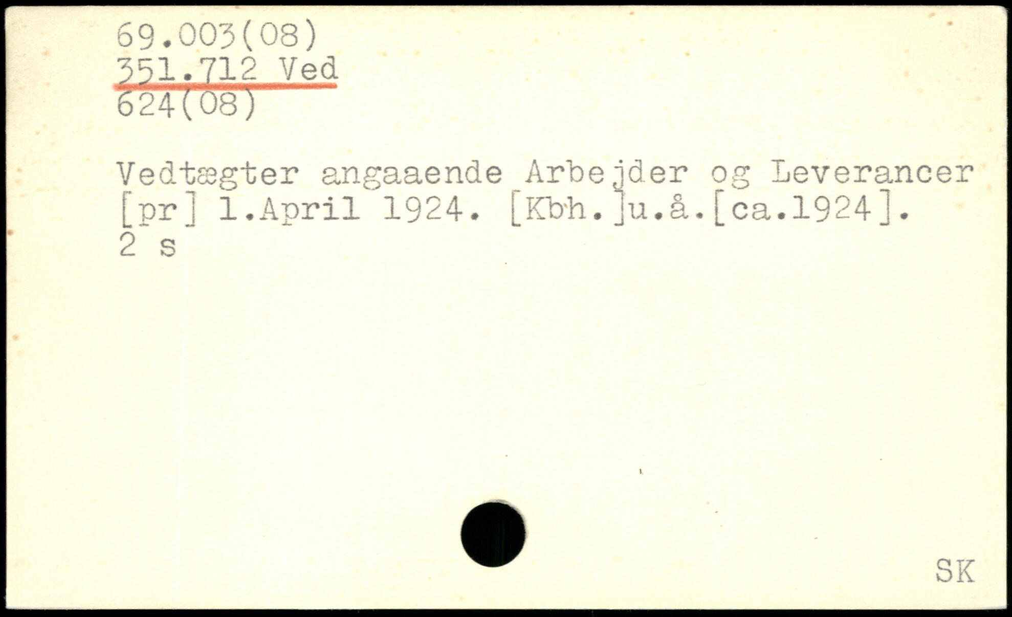 Vedtægter angaaende Arbeider og leverancer [pr] 1. April 1924. [Kb'h. jiuå. [ca.1924]. 2~ s