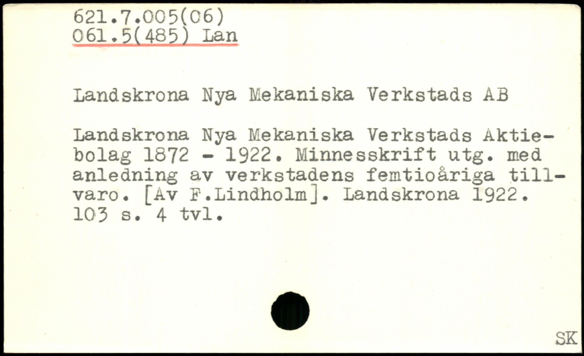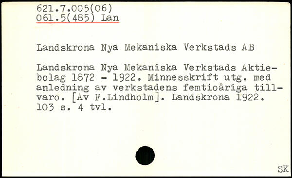 Landskrona Nya Mekaniska Verkstads AB Landskrona Nya Mekaniska Verkstads Aktiebolag 1672 - 1922. Minnesskrift utg. med anledning av verkstadens femtioåriga tillvaro. [Av F.Lindholm]. Landskrona 1922.
