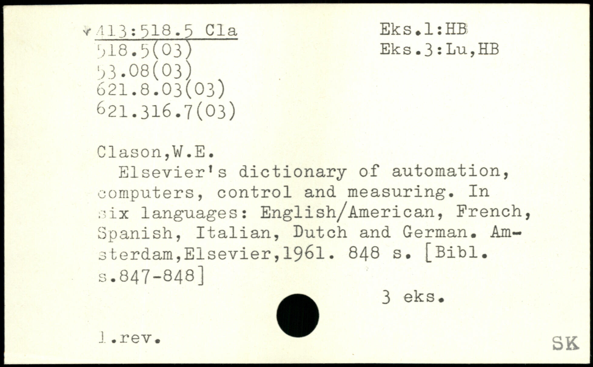 Elsevier’s dictionary of automation, computers, control and measuring. In six languages: English/American, French, Spanish, Italian, Dutch and German.