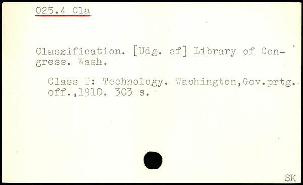 Classification. [Udg. af] Library of Congress. Wash. Class T: Technology. Washington,Gov.prtg. off.,1910.