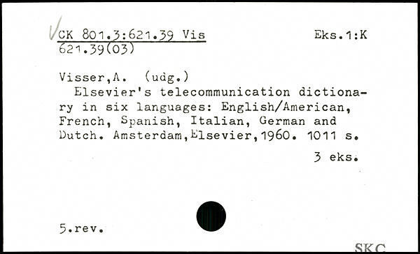Visser,A. Cudg.) Elsevier's telecommunication dictionary in six languages: English/American, French, Spanish, Italian, German and Dutch, Amsterdam, Elsevier,'1960
