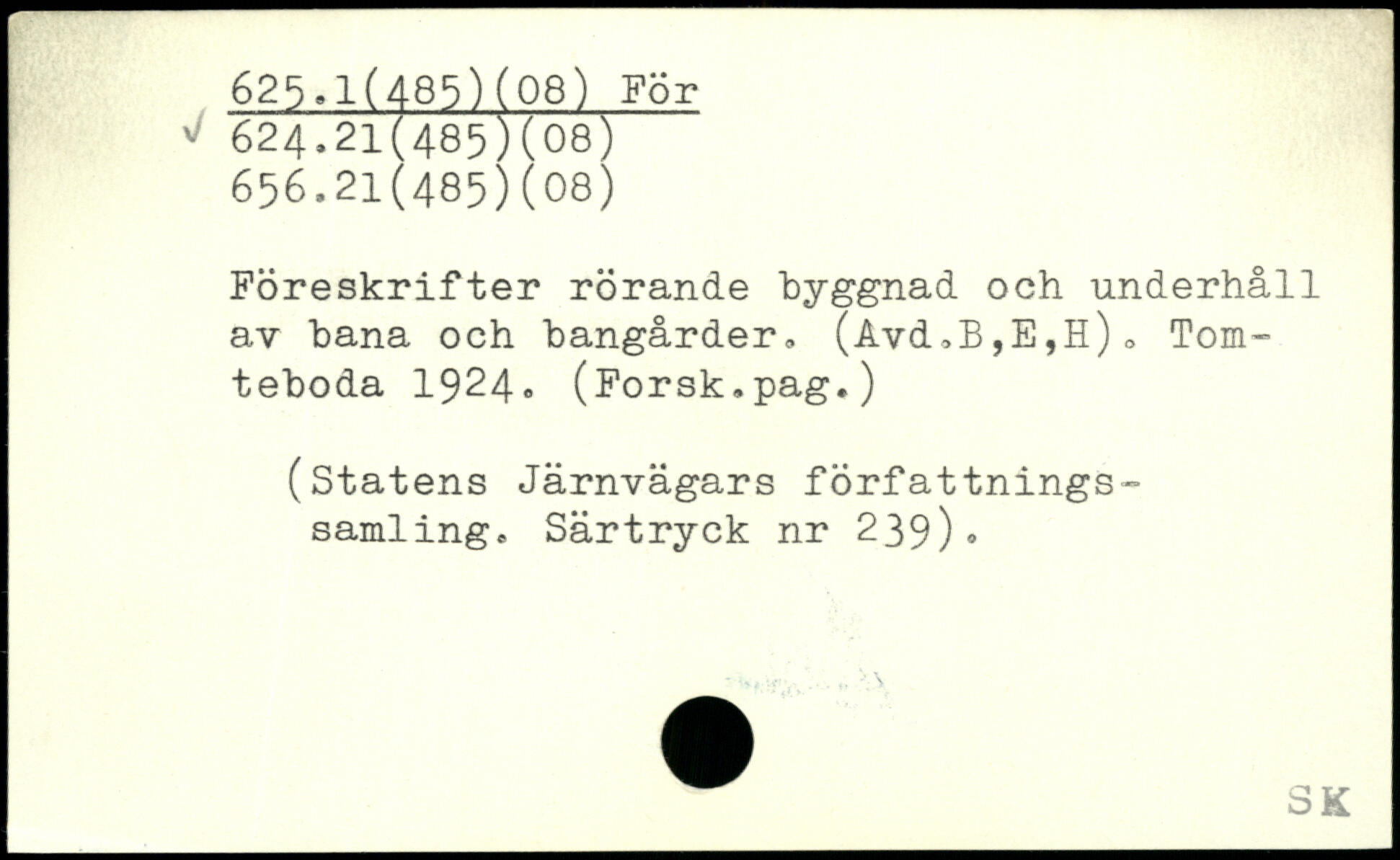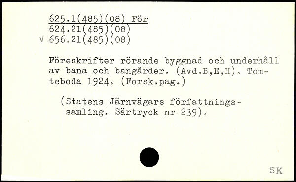 Föreskrifter rörande byggnad och underhåll av bana och bangårder, (Avd,B,E,H)0 Tom-teboda 1924, (Forsk.pag.) (Statens Järnvägars författningssamling. Särtryck nr 239).