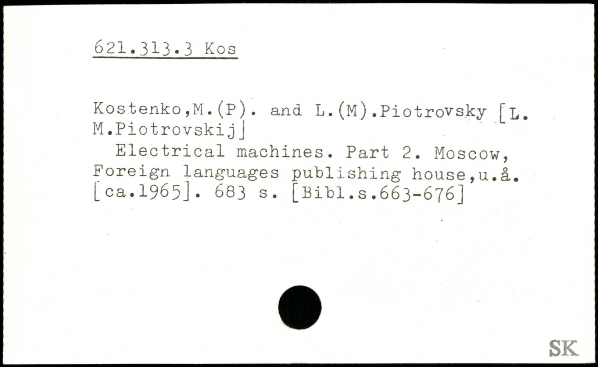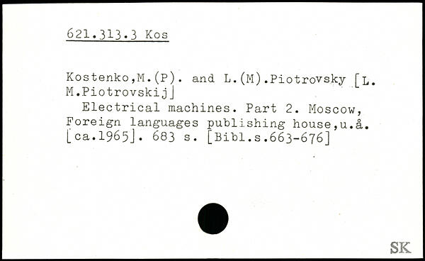 Kostenko ,M. (P). and L. (m). Piotrovsky M.PiotrovskijJ Electrical machines. Part 2. Moscow, Foreign languages publishing house,u.a. [ca.1965j.