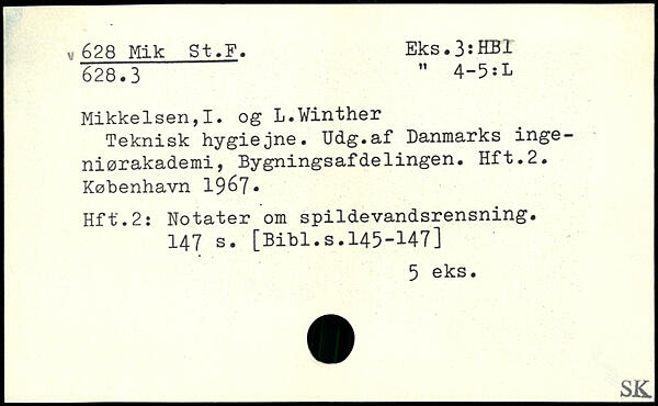 Teknisk hygiejne. Udg.af Danmarks ingeniørakademi, Bygningsafdelingen. Hft.2. København 19&7. Hft'.2: Notater om spildevandsrensning.