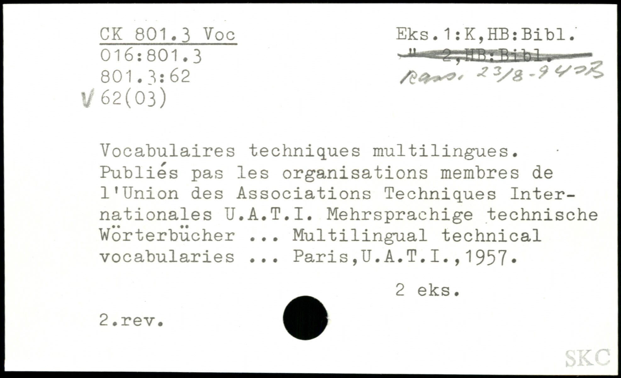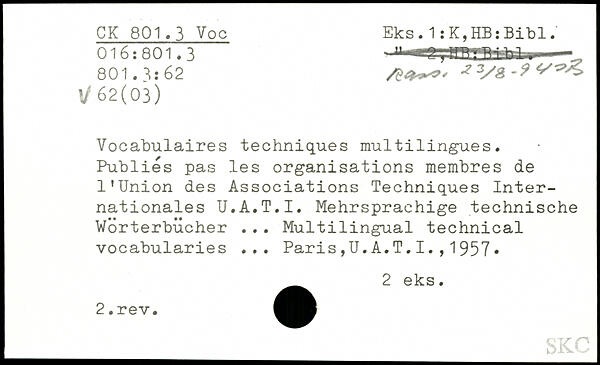 Vocabulaires techniques multilingues. Publiés pas les organisations membres de l’Union des Associations Techniques Internationales U.A.T.I. Mehrsprachige technische Wörterbücher ... Multilingual technical vocabularies ...
