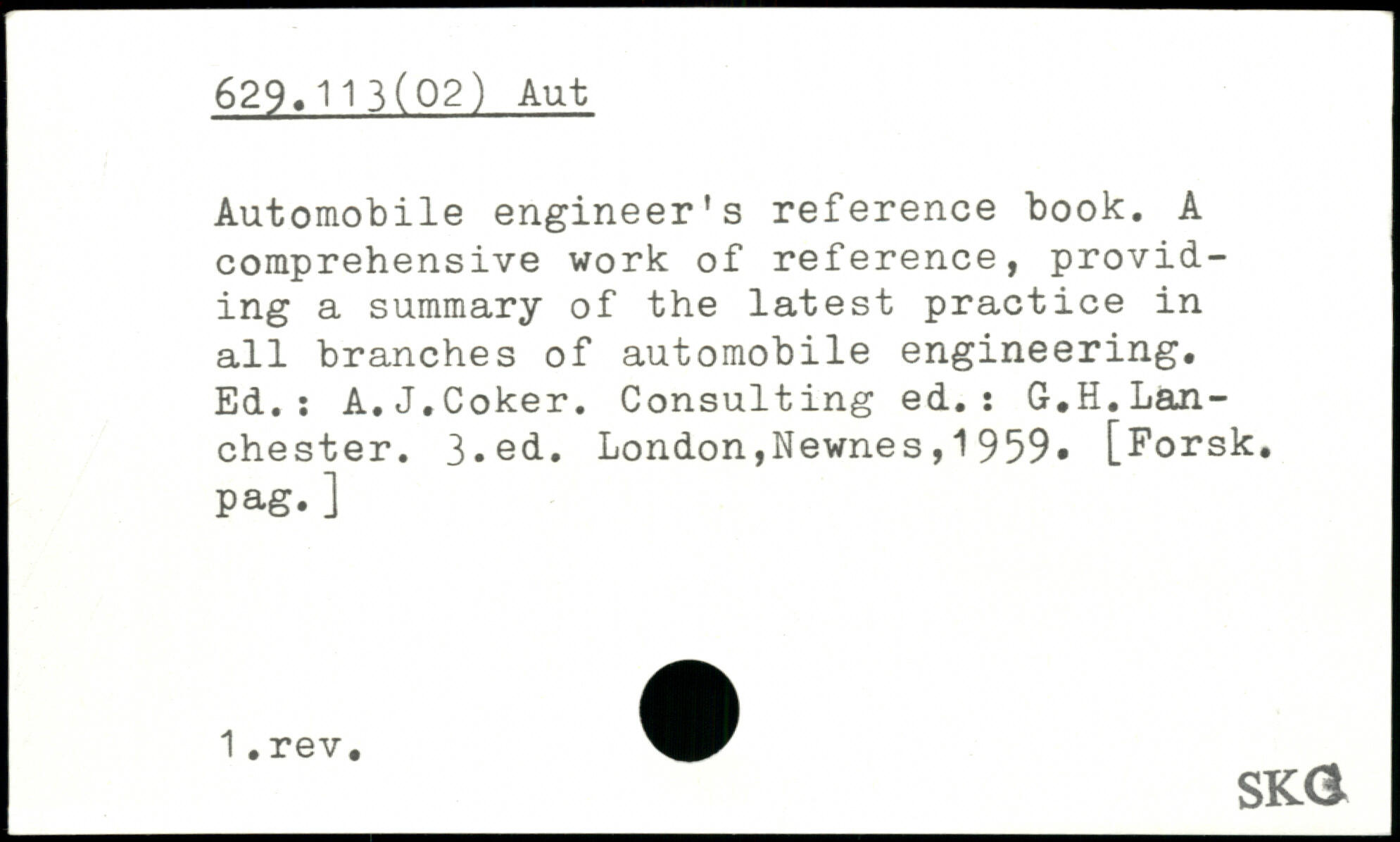 Automobile engineer’s reference book. A comprehensive work of reference, providing a summary of the latest practice in all branches of automobile engineering. Ed.; A.J.Coker. Consulting ed.: G.H.Lan-chester.