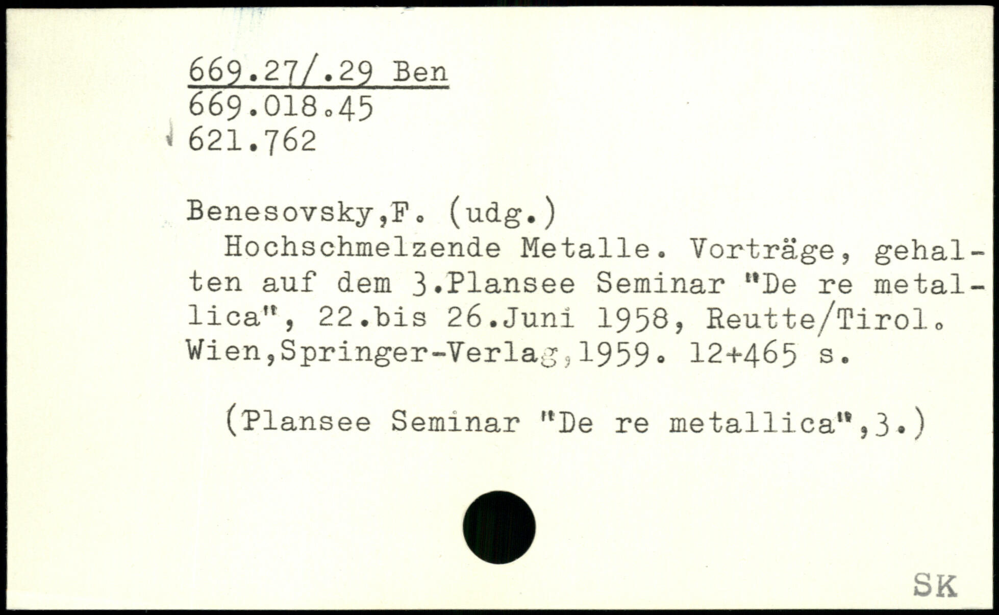 Benesovsky,F, (udg.) Hochschmelzende Metalle. Vorträge, gehalten auf dem 3.Plansee Seminar “De re metal-lica“, 22.bis 26.Juni 1958