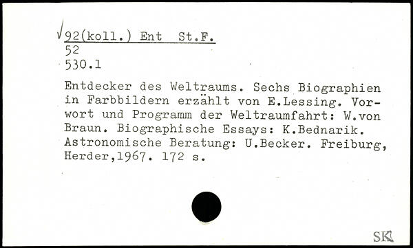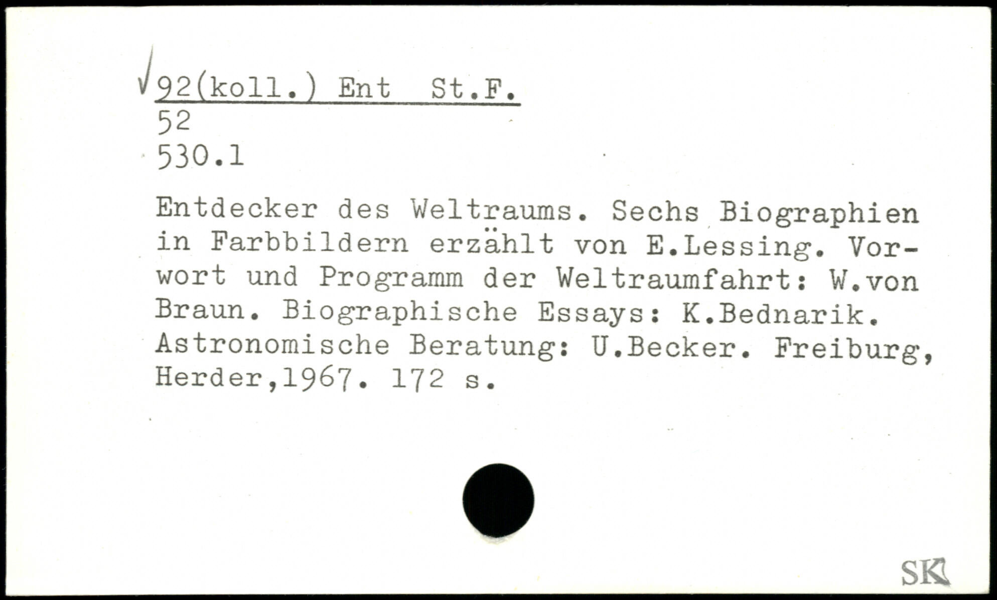 Entdecker des Weltraums. Sechs Biographien in Farbbildern erzählt von E.Lessing. Vorwort und Programm der Weltraumfahrt: W.von Braun. Biographische Essays: K.Bednarik. Astronomische Beratung: U.Becker.