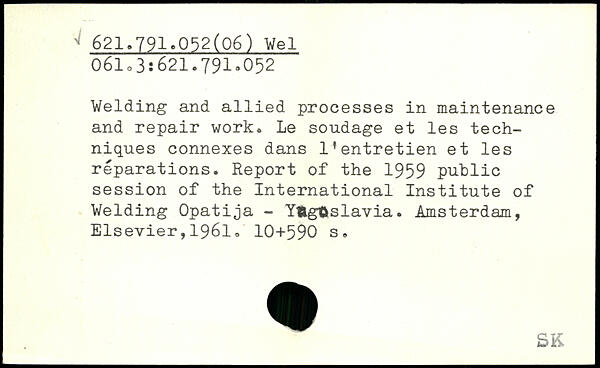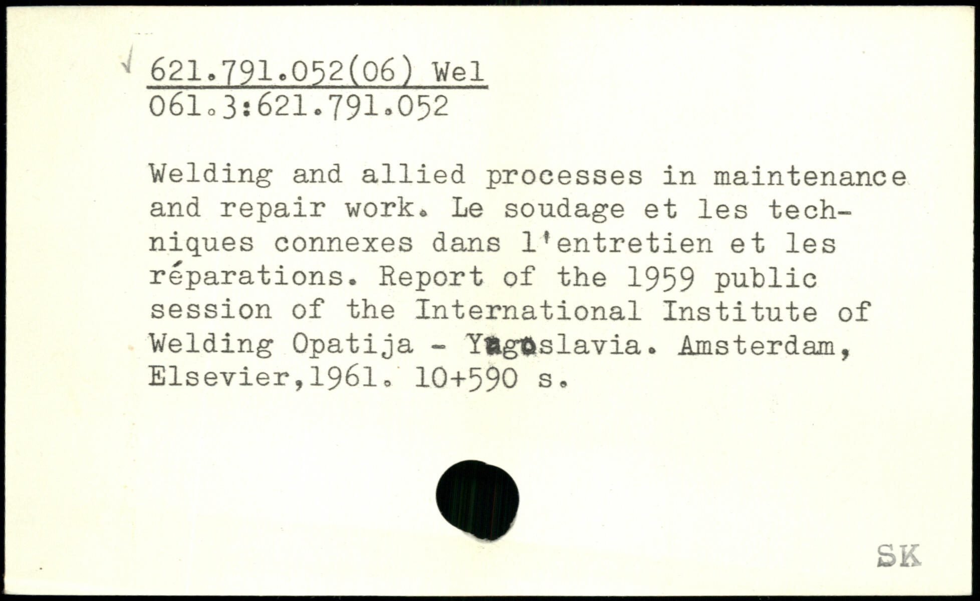 Welding and allied processes in maintenance and repair work. Le soudage et les techniques connexes dans lfentretien et les réparations. Report of the 1959 public session of the International Institute of Welding Opatija - Yugoslavia.