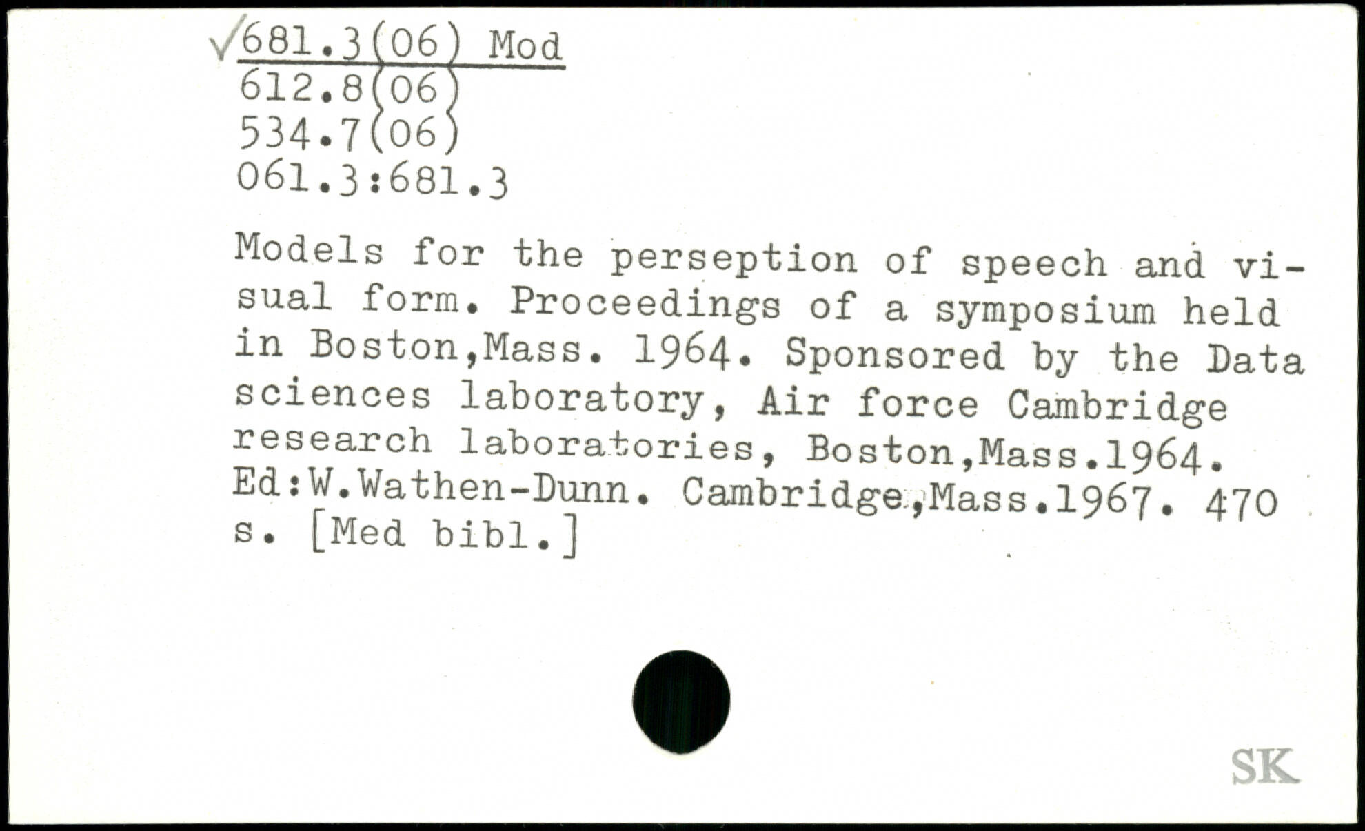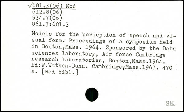 Models for the perseption of speech and visual form. Proceedings of a symposium held in Boston,Mass. 1964. Sponsored by the Data sciences laboratory, Air force Cambridge research laboratories, Boston,Mass.1964. Ed:W.Wathen-Dunn. Cambridge.,Mass. 1967.