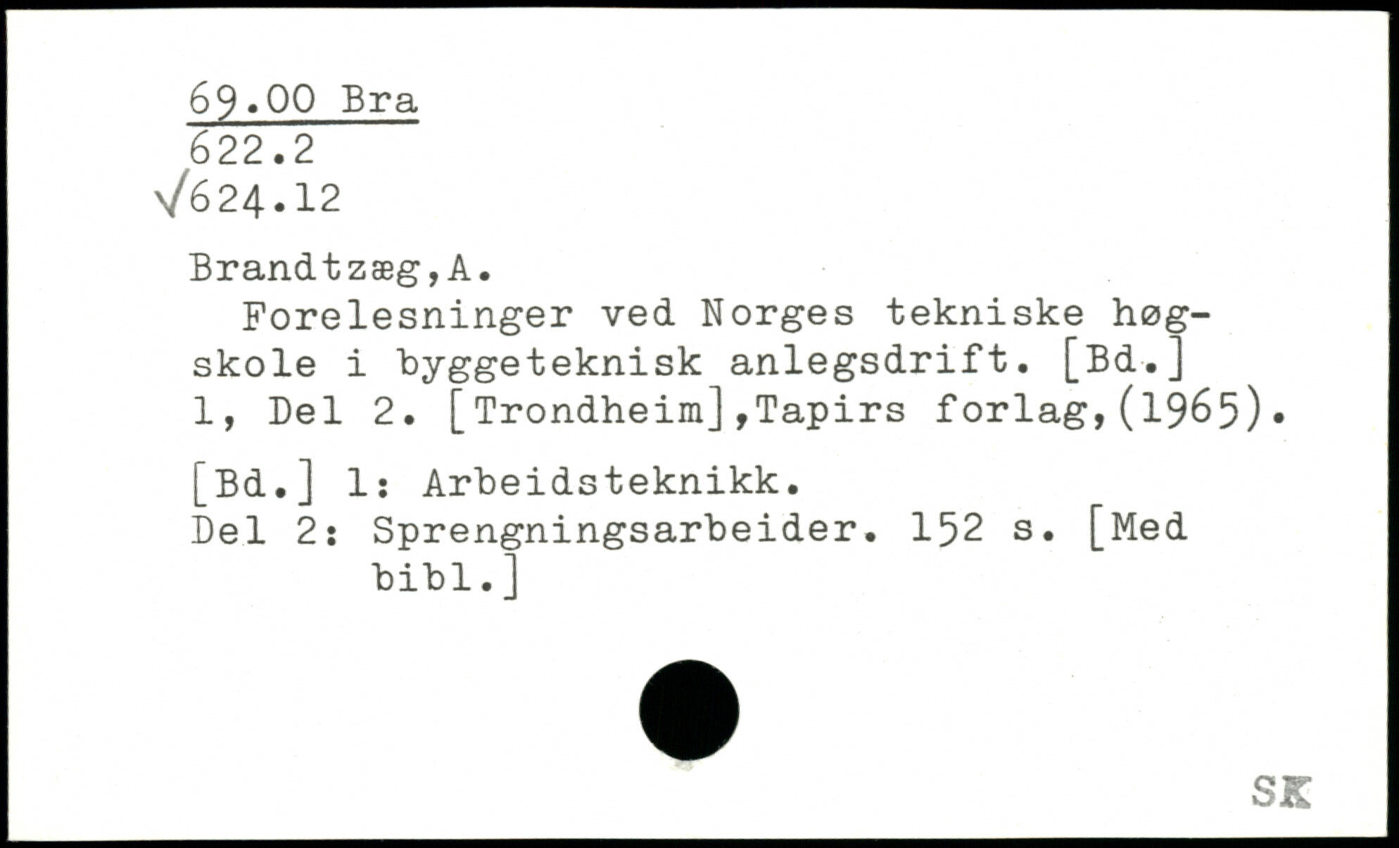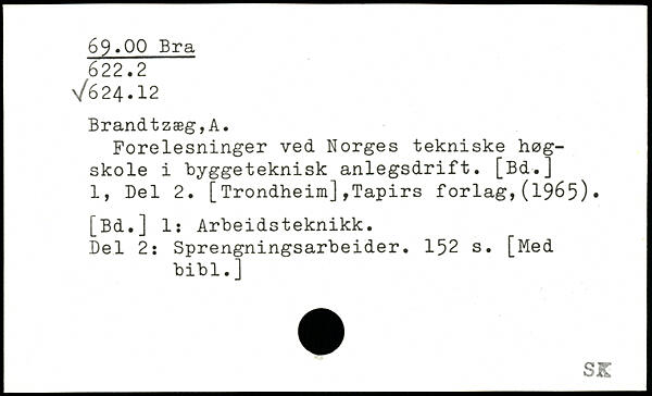 Forelesninger ved Norges tekniske høgskole i “byggeteknisk anlegsdrift. [Bd.] 1, Bel 2. [Trondheim],Tapirs forlag,(1965). [Bd.] 1: Arbeidsteknikk. Bel 2: Sprengningsarbeider.