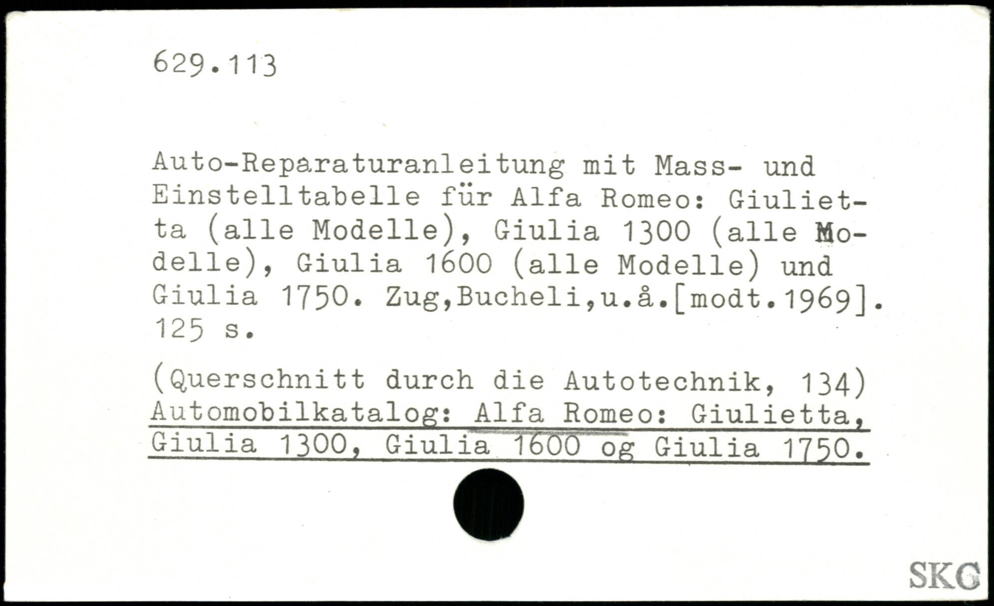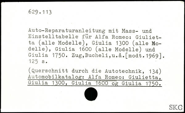 Auto-Reparaturanleitung mit Mass- und Einstelltabeile fur Alfa Romeo: Giuliet-ta (alle Modelle), Giulia 1300 (alle Modelle), Giulia 1600 (alle Modelle) und Giulia 1750, Zug,Bucheli,u.ä.[modt.1969].