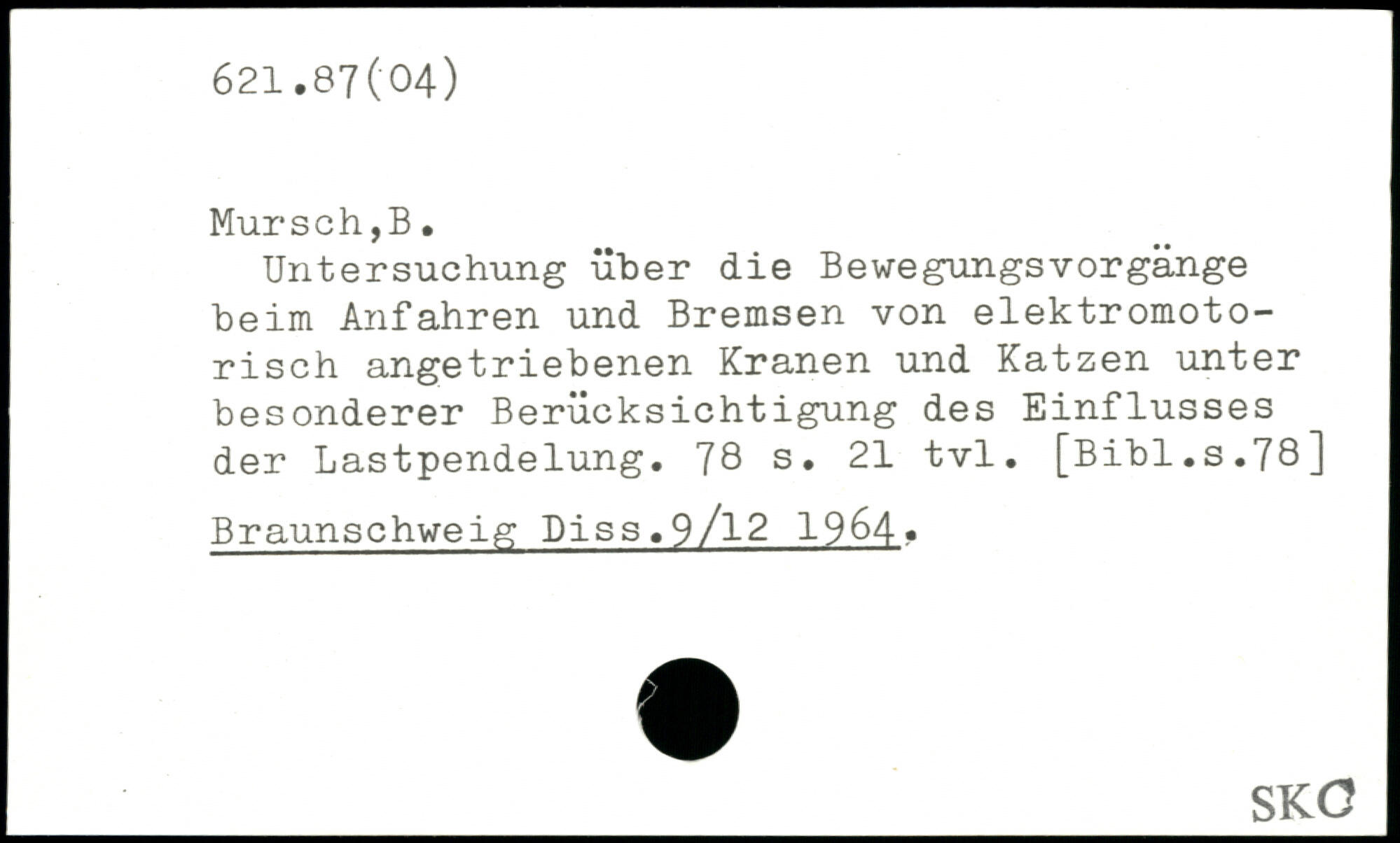 Untersuchung über die Bewegungsvorgänge beim Anfahren und Bremsen von elektromotorisch angetriebenen Kranen und Katzen unter besonderer Berücksichtigung des Einflusses der Lastpendelung.