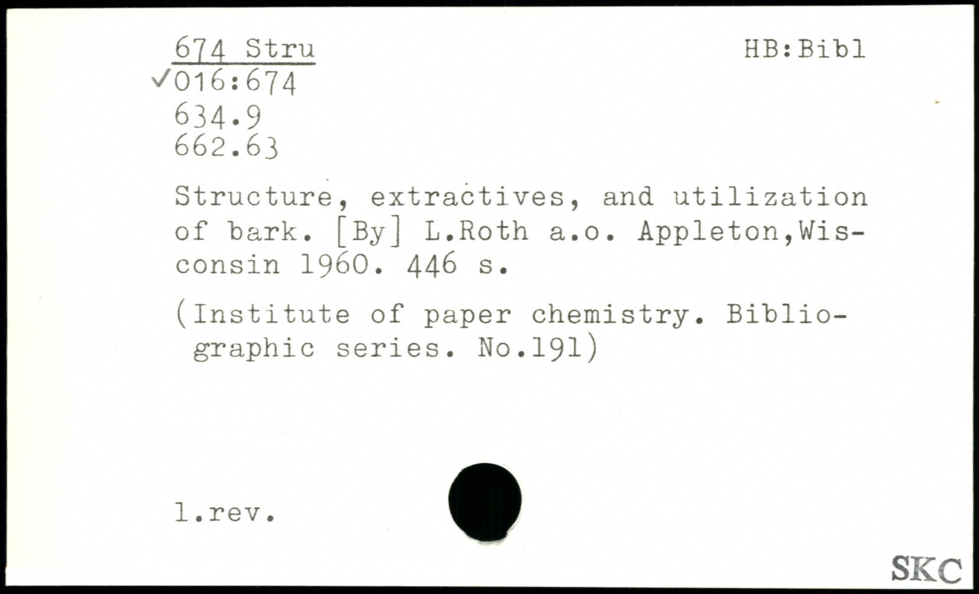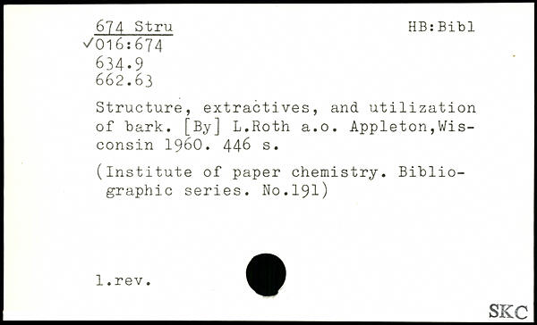 Structure, extractives, and utilization of bark. [By] L.Roth a.o. Appleton,Wisconsin 1960.