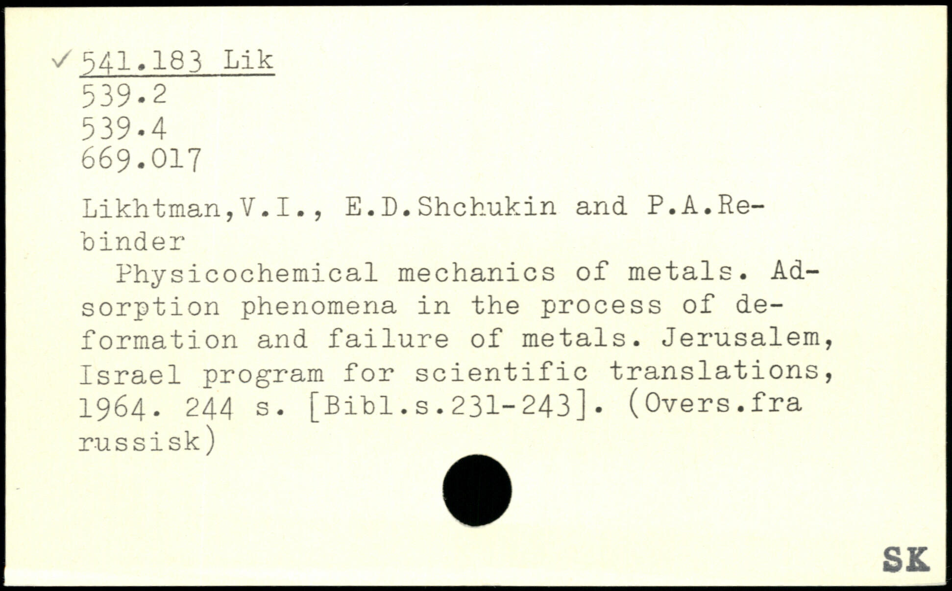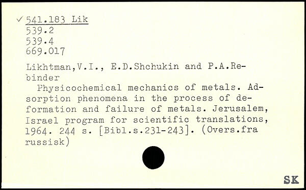 Physicochemical mechanics of metals. Adsorption phenomena in the process of deformation and failure of metals. Jerusalem, Israel program for scientific translations, 1964.