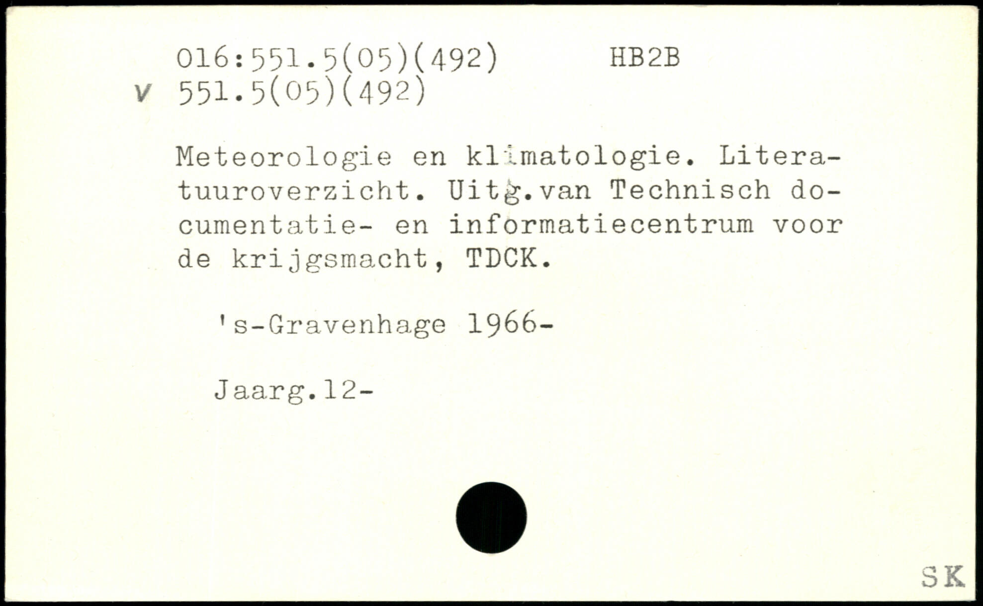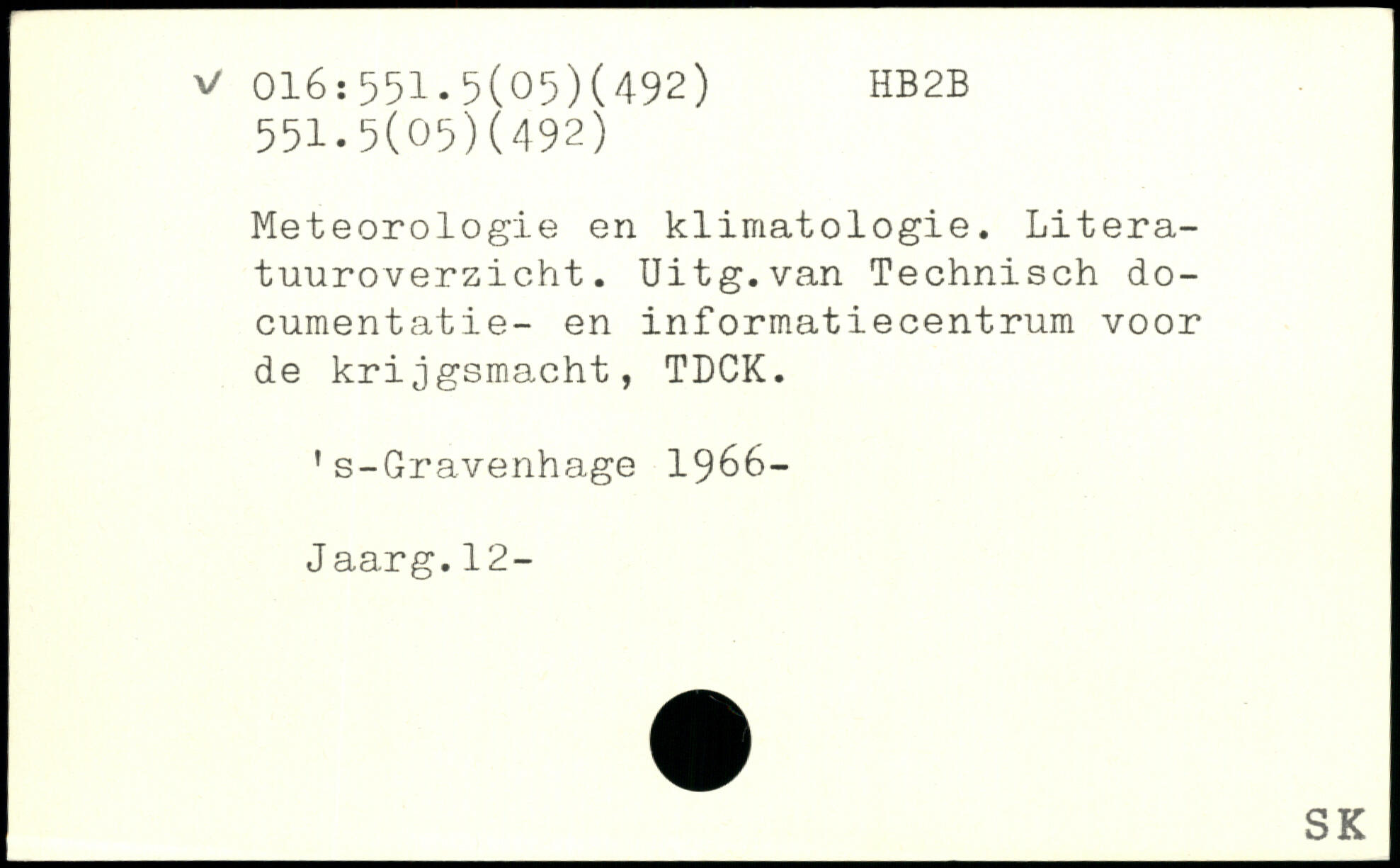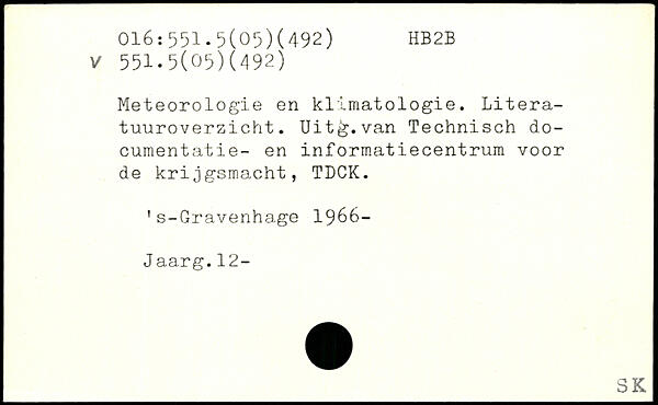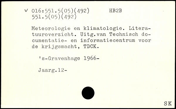 Meteorologie en klimatologie. Litera-tuuroverzieht. Uitg.van Technisch do-cumentatie- en informatiecentrum voor de krijgsmacht, TDCK. 's-Gravenhage 1966- J aarg.12-