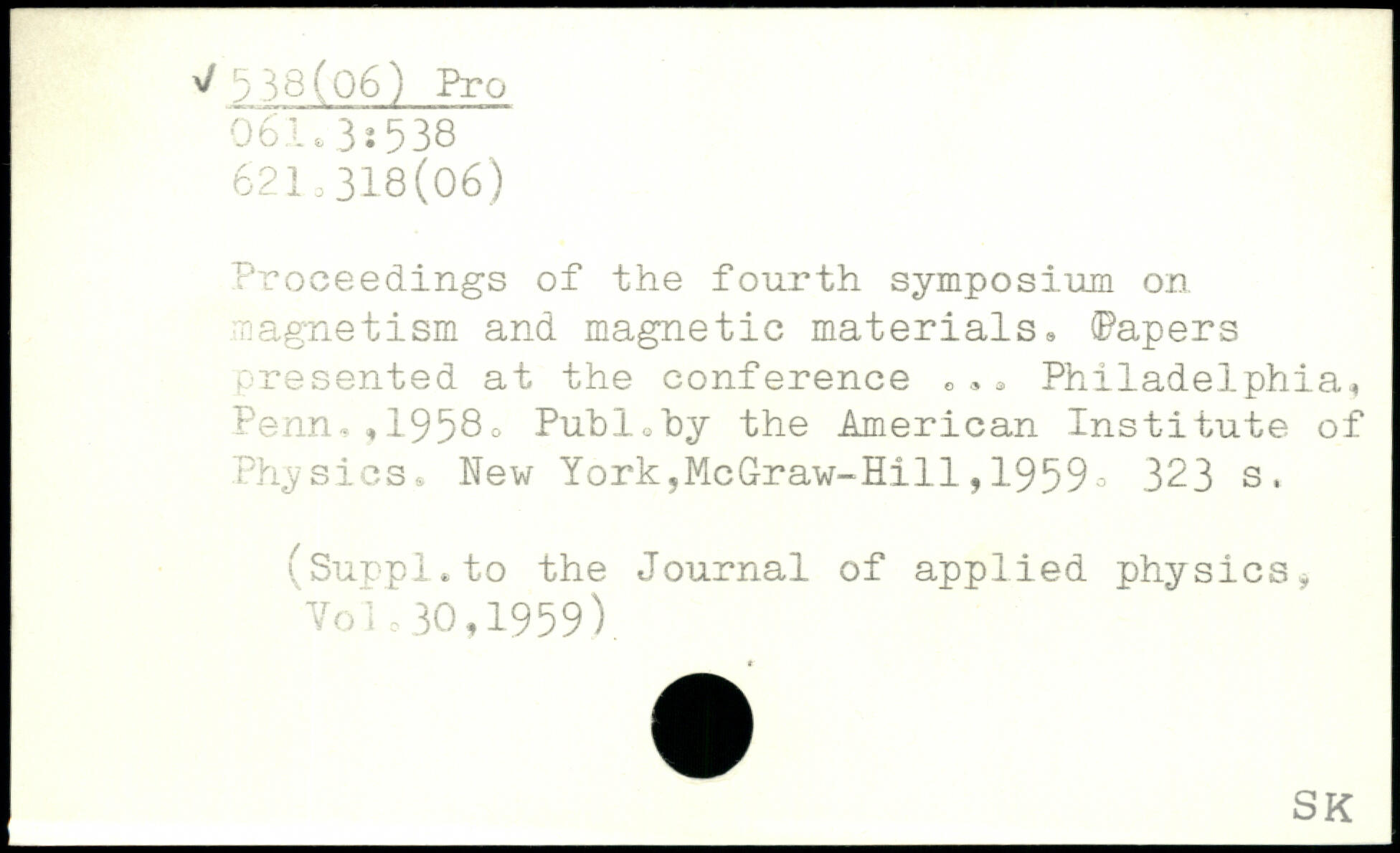 Proceedings of the fourth symposium on agnetism and magnetic materials. (Papers presented at the conference ... Philadelphia. Penn.,1958o Publ,by the American Institute of Physios.