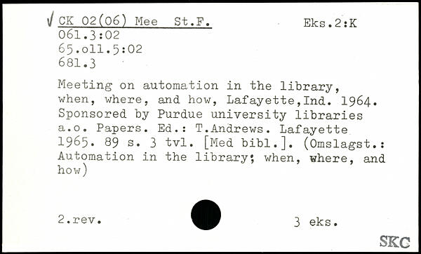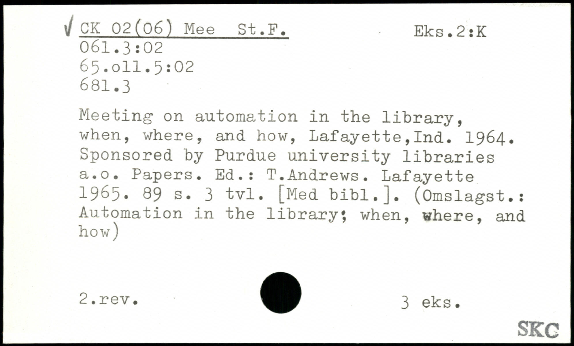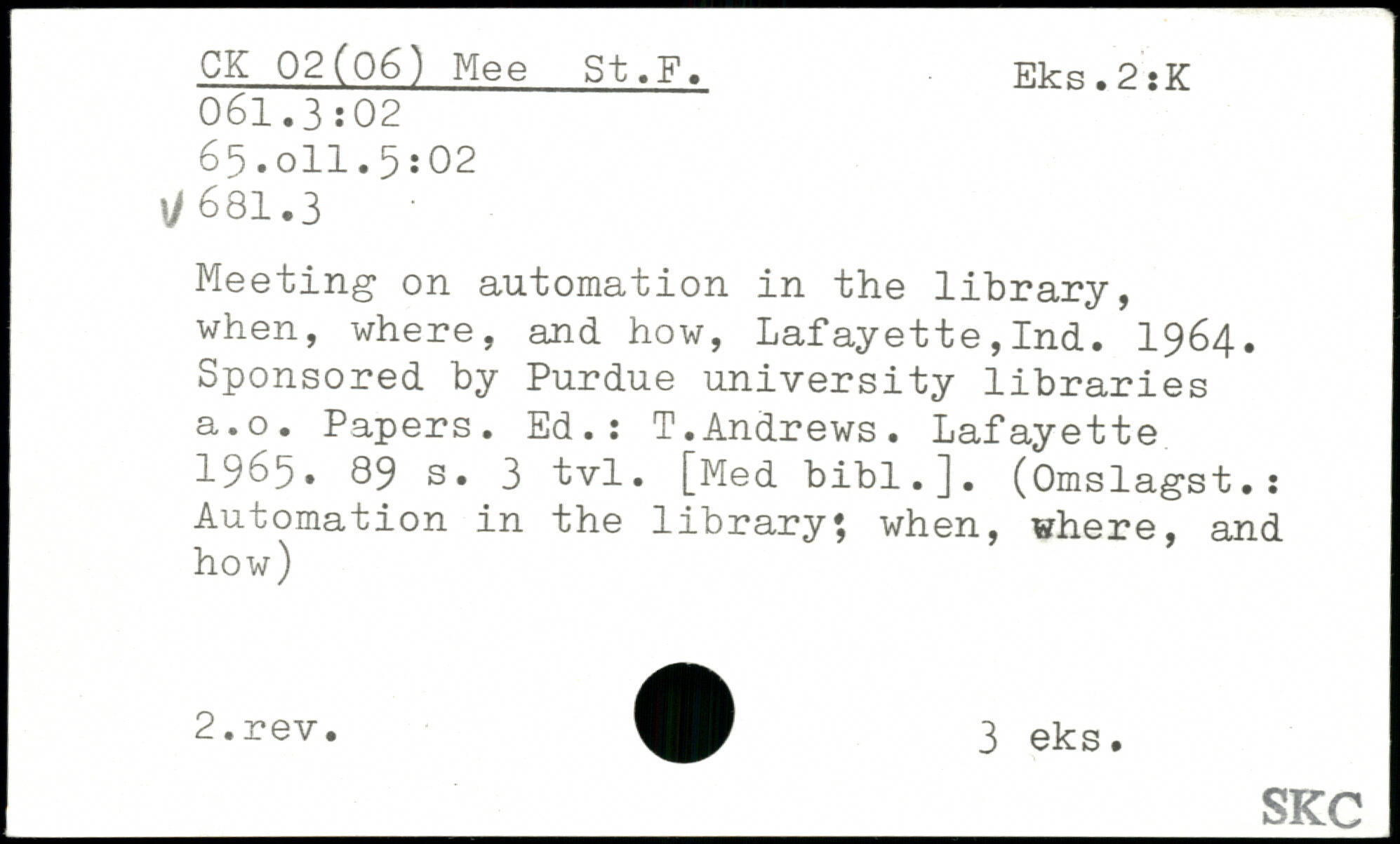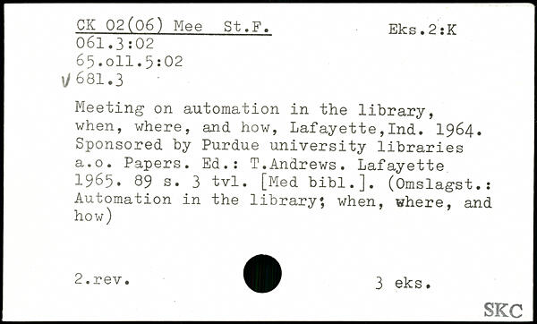Meeting on automation in the library, when, where, and how, Lafayette,Ind. 1964. Sponsored by Purdue university libraries a.o. Papers. Ed.: T.Andrews. Lafayette 1965