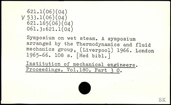 Symposium on wet steam. A symposium arranged by the Thermodynamics and fluid mechanics group, (Liverpool) 1966.