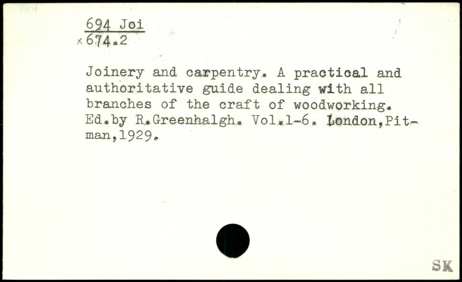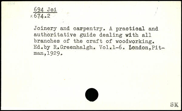 Joinery and carpentry. A practical and authoritative guide dealing with all branches of the craft of woodworking. Ed.by R.Greenhalgh. Vol,l~6. tondon,Pit~ man,1929.