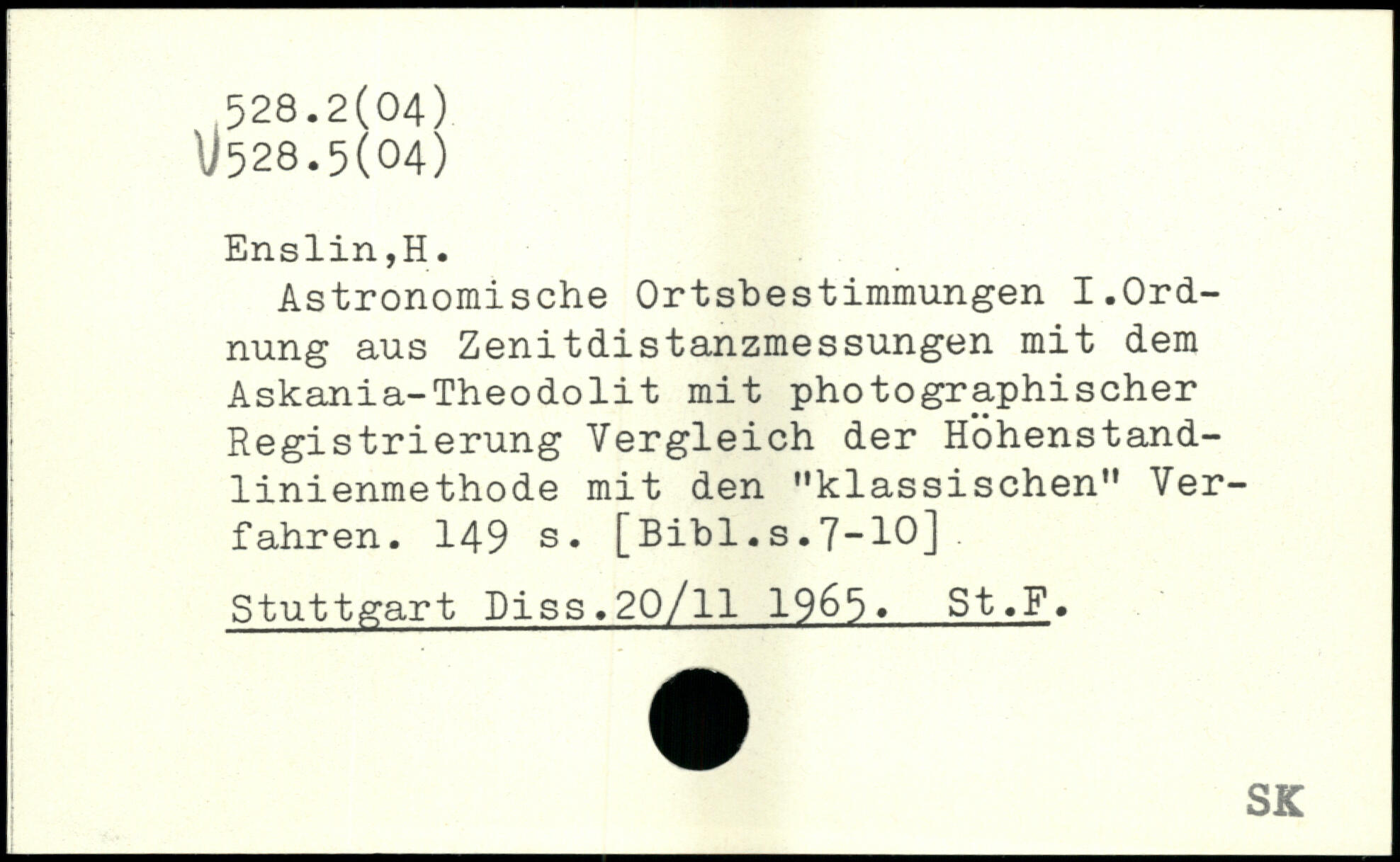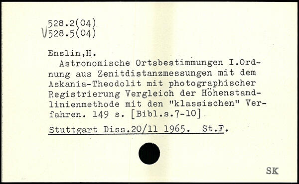 Astronomische Ortsbestimmungen I.Ordnung aus Zenitdistanzmessungen mit dem Askania-Theodolit mit photographischer Registrierung Vergleich der Hohenstand-linienmethode mit den "klassischen” Verfahren.
