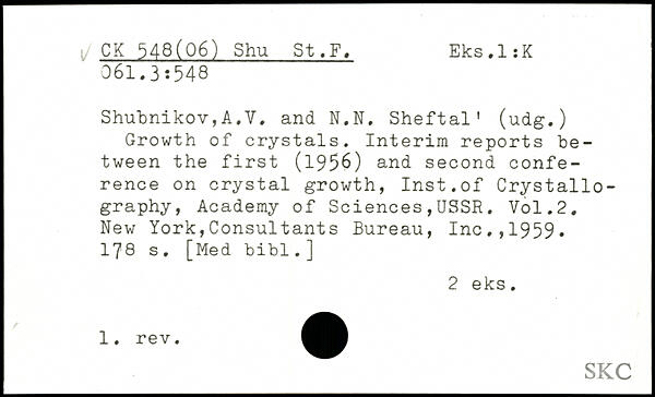 Shubnikov,A.Y. and N.N. Sheftal' (udg.) Growth of crystals. Interim reports between the first (1956) and second conference on crystal growth, Inst.of Crystallography, Academy of Sciences,USSR.