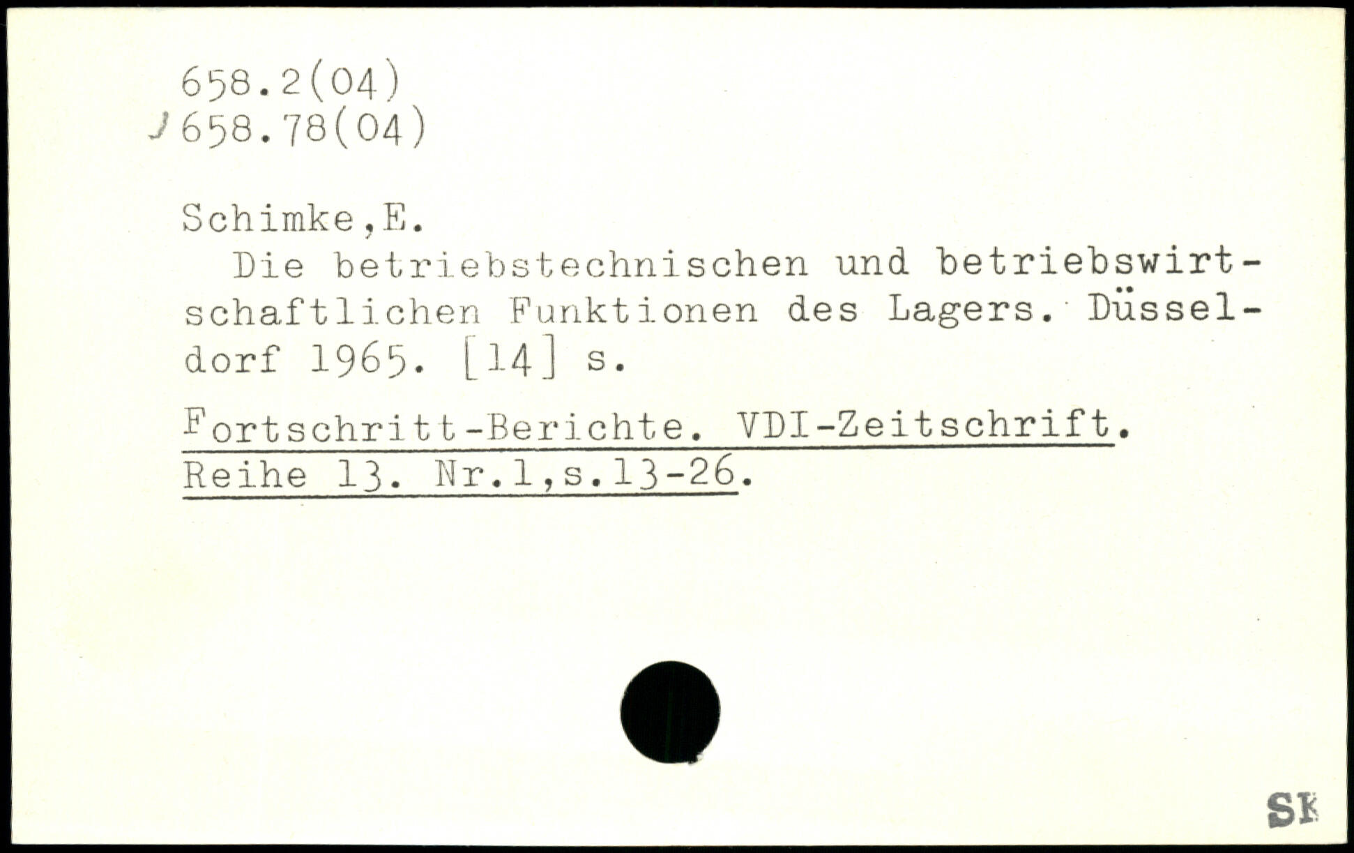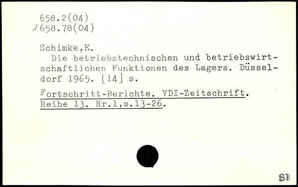 Die betriebstechnischen und betriebswirtschaftlichen Funktionen des Lagers. Düsseldorf 1965. [14] s. Eortschrit b-Berichte. YDI-Zeitschrift. Reihe 13. Nr.1,s.13-26.