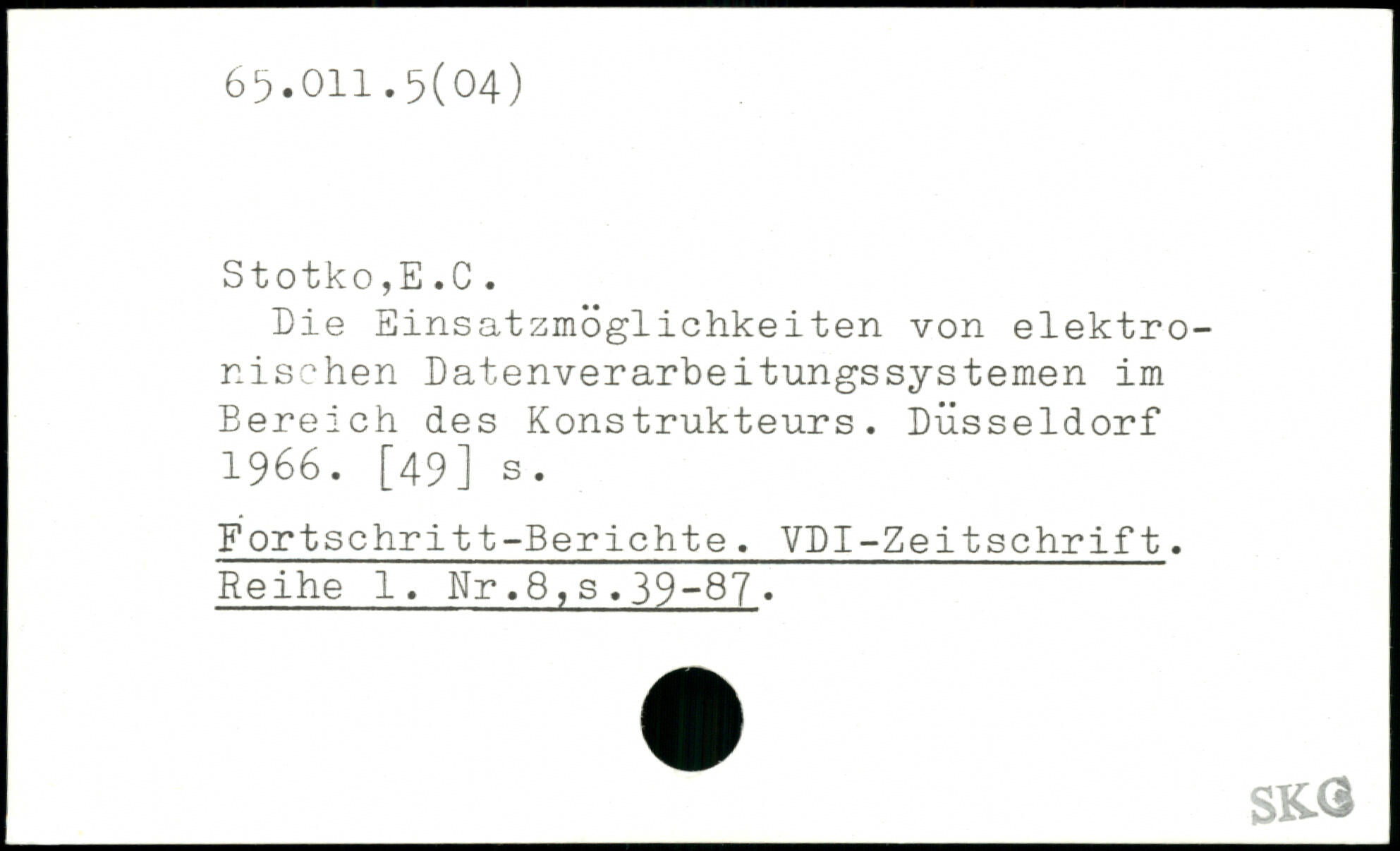 Die Einsatzmöglichkeiten von elektronischen Datenverarbeitungssystemen im Eereich des Konstrukteurs. Düsseldorf 1966. [49] s. Fortschritt-Berichte. VDI-Zeitschrift. Reihe 1, Nr.8,s.39-87, _SK-Q