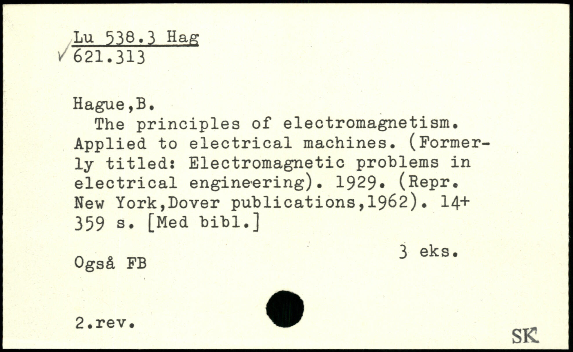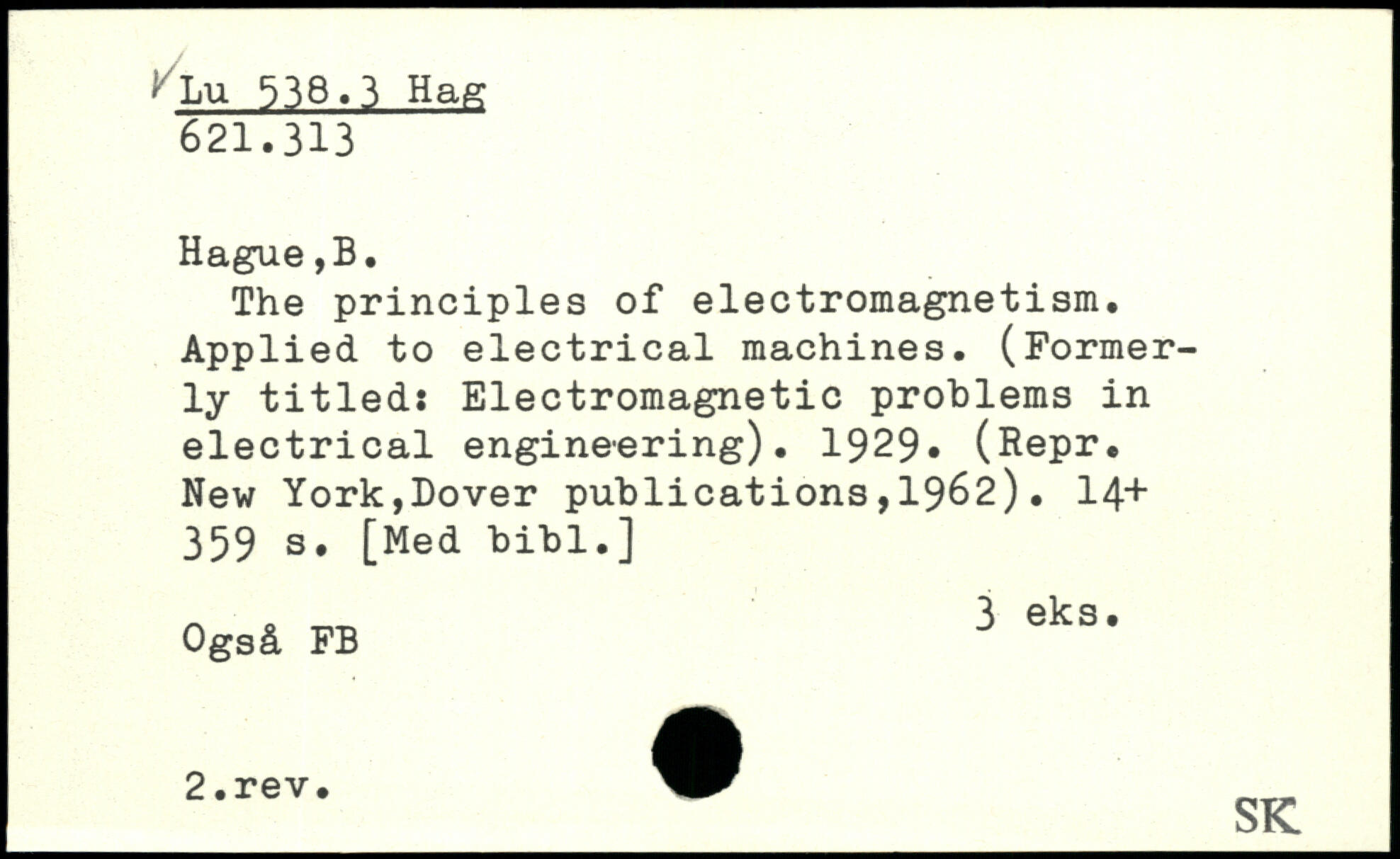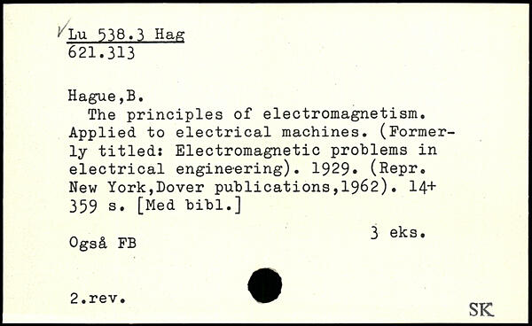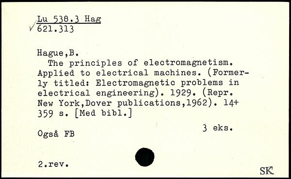 The principles of electromagnetism. Applied to electrical machines. (Formerly titled: Electromagnetic problems in electrical engineering). 1929, (Repr.