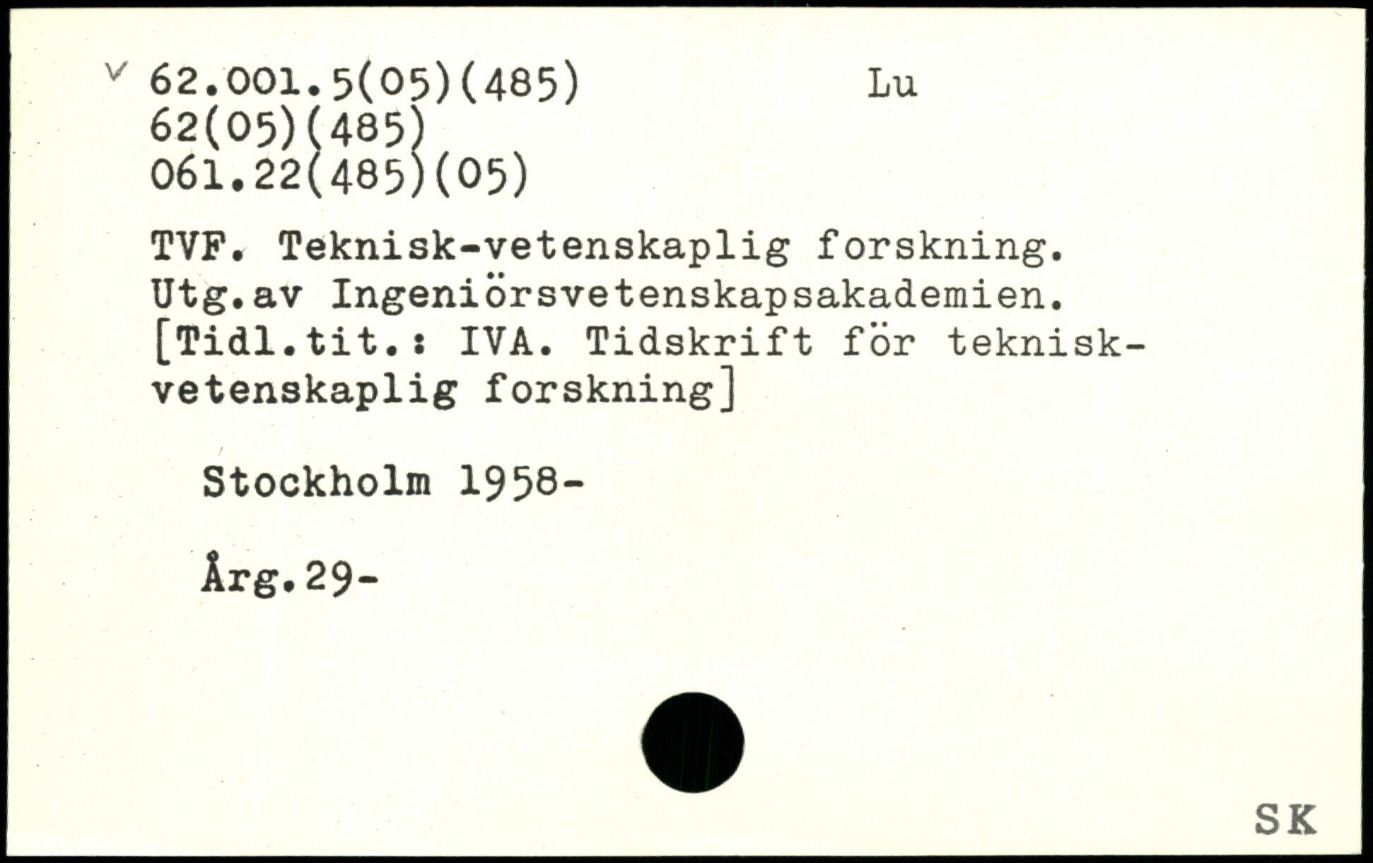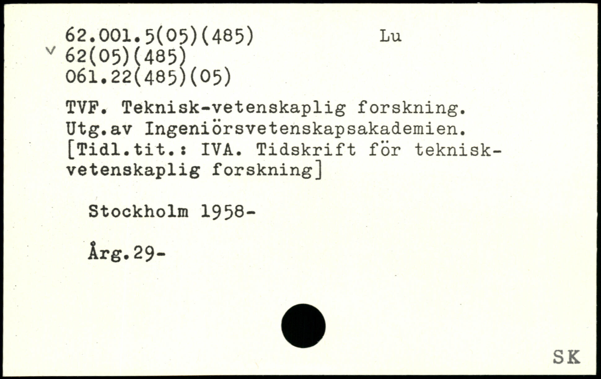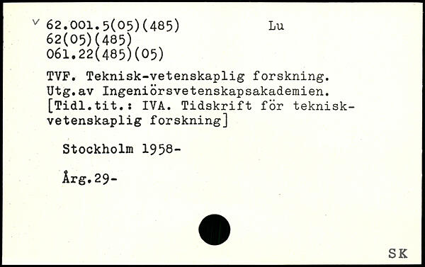 TVF. Teknisk-vetenskaplig forskning. Utg.av Ingeniörsvetenskapsakademien. [Tidl.tit.: IVA. Tidskrift för tekniskvetenskaplig forskning]