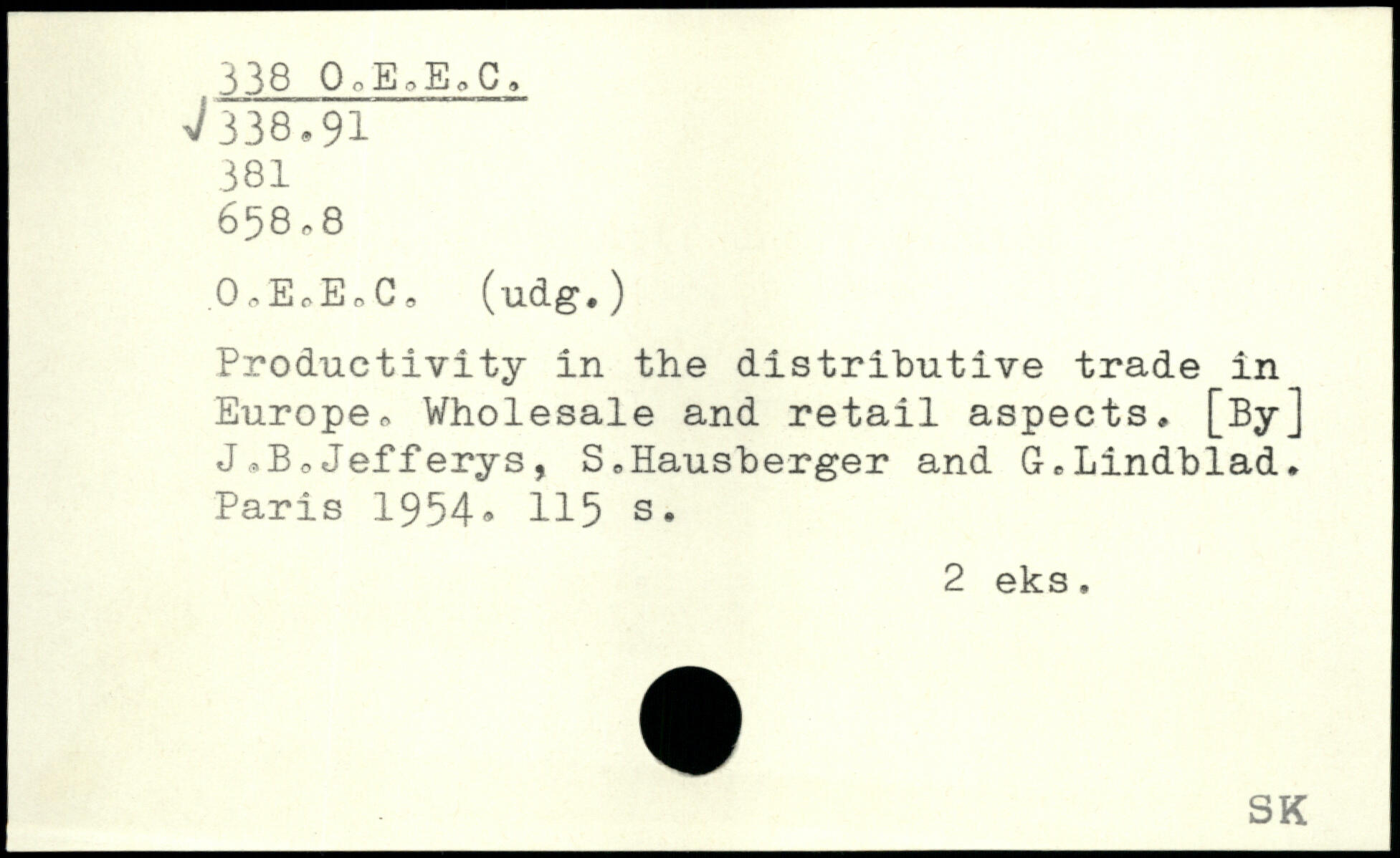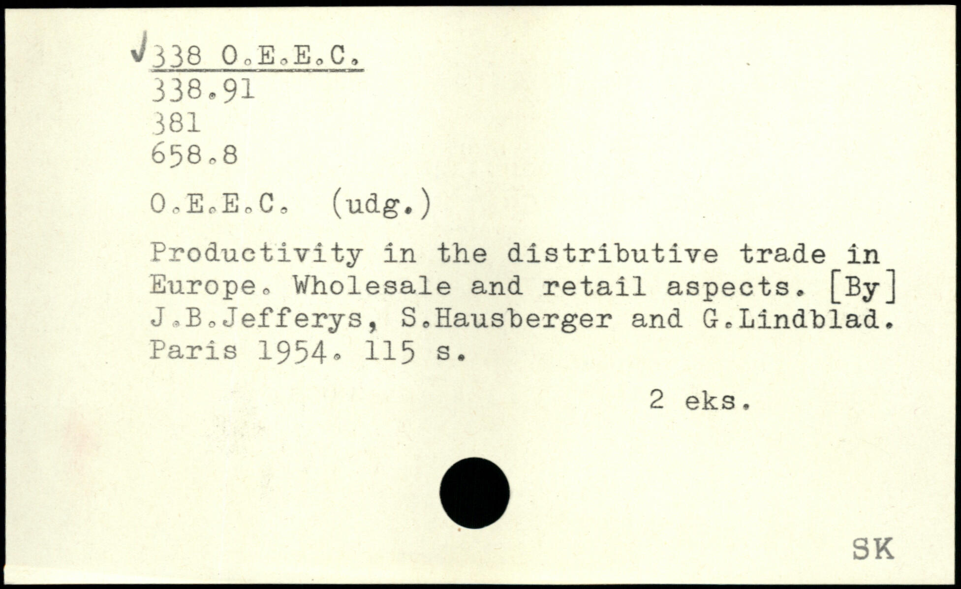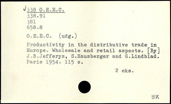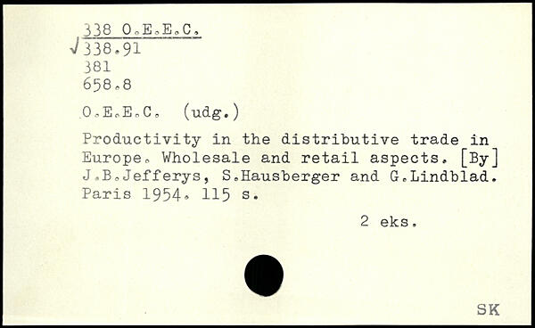 0,E,EoCo (udg.) Productivity in the distributive trade in Europe, Wholesale and retail aspects, [By] J,B,Jefferys, S,Hausberger and G,Lindblad.